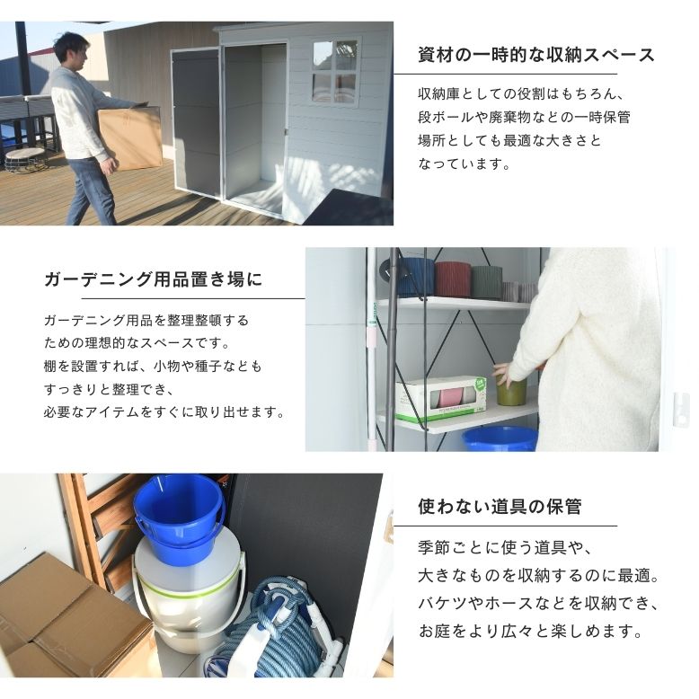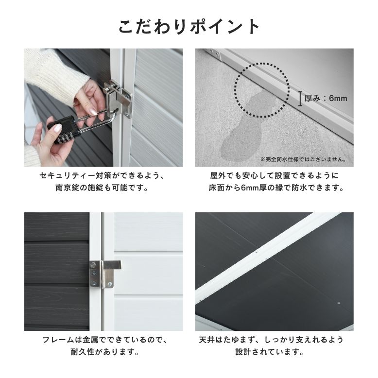 ・収納庫・物置に関しましては、完全防水仕様ではございません。隙間から雨水が入る場合もございます。あらかじめご了承ください。
