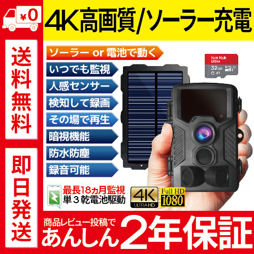 防犯カメラ セット 屋外 家庭用 トレイルカメラ 監視 小型 電池式 ソーラー充電 4K超高画質 ソーラーパネル 野外 送料無料 爆買