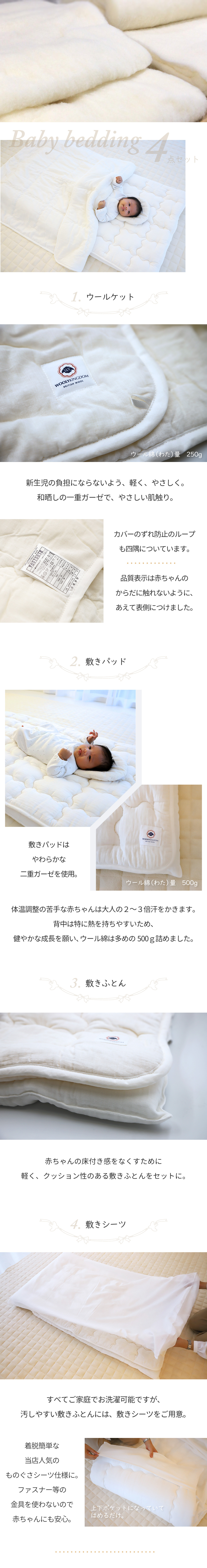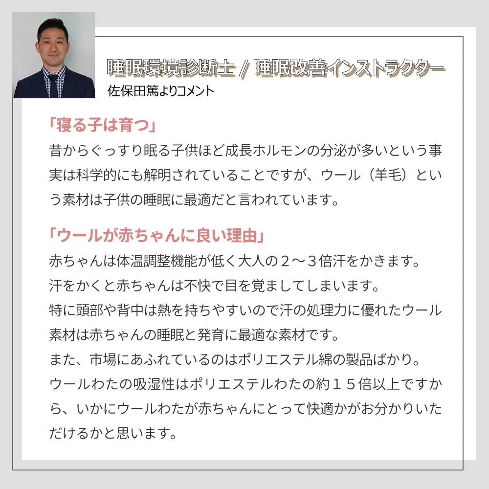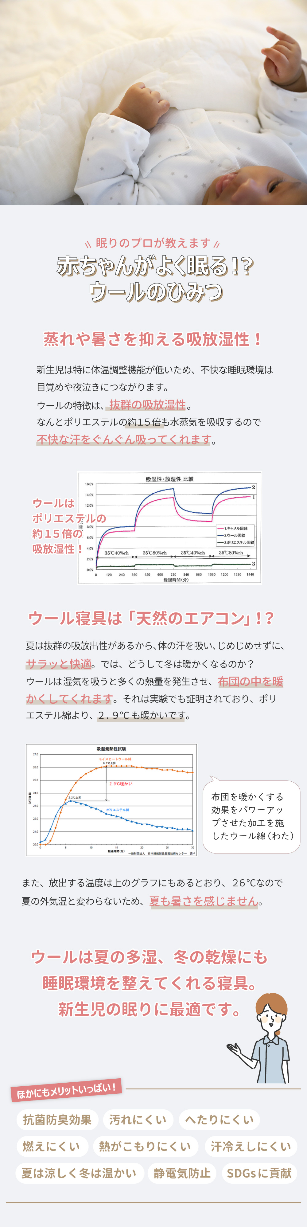 「昔から寝る子は育つ」というほど、寝ている間に成長ホルモンの分泌が多いということは、科学的にも解明されています。ウールは吸放湿性に優れているため、赤ちゃんの睡眠環境を整えてくれる最適な素材です。明治から続く寝具店の眠りのプロが赤ちゃんに最適な寝具をご用意しました。