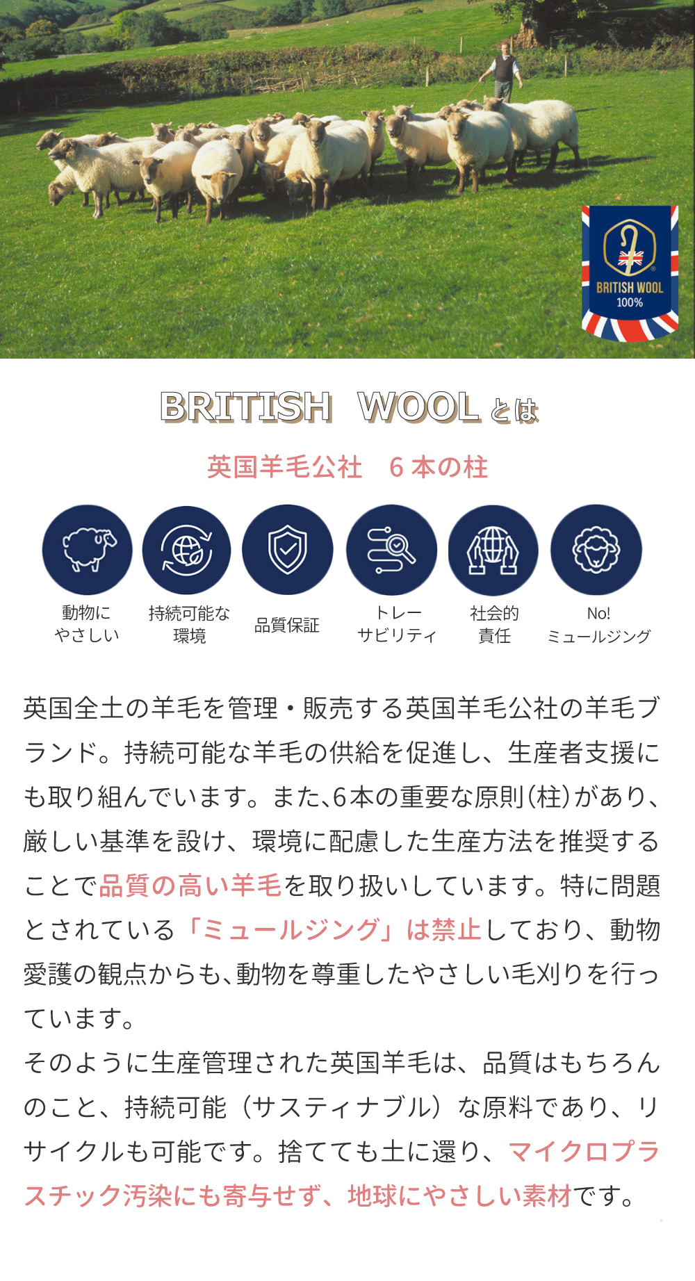 イギリス産のウールは耐久性が非常に高いのが特徴です。 弾力性・嵩高性にも優れ、赤ちゃんの身体をしっかり支えてくれます。 またイギリスでは産業よりも羊が優先され、高い管理基準に沿って生産されているため 羊毛の中でも安心・安全の天然素材となっています。