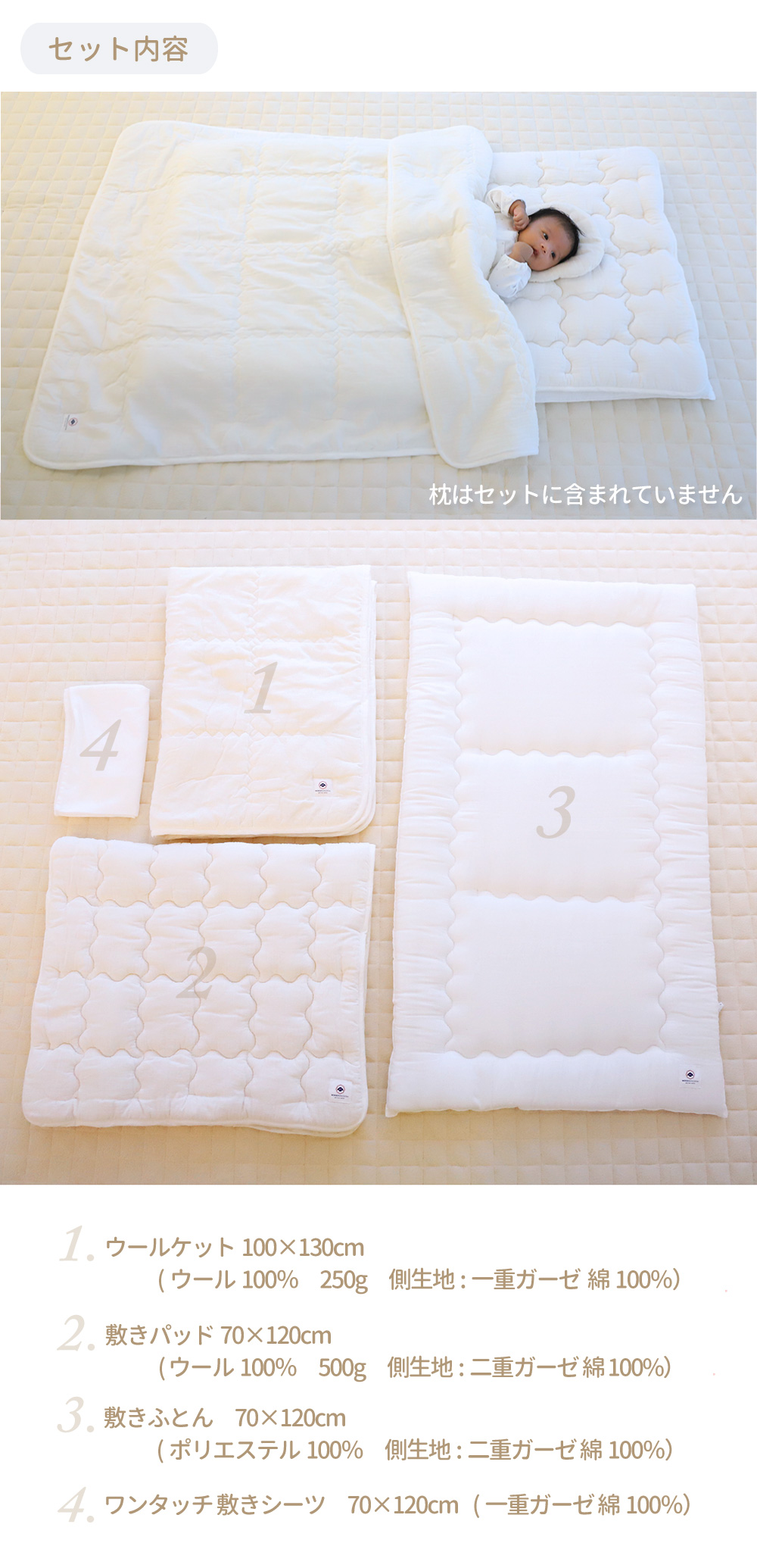 ウールケットには時間をかけてやわらかく仕上げた和晒しガーゼ。敷きには、ワンウォッシュ加工を施しているダブルガーゼ。普通のガーゼよりもやわらかく、赤ちゃんの肌になじみます。
