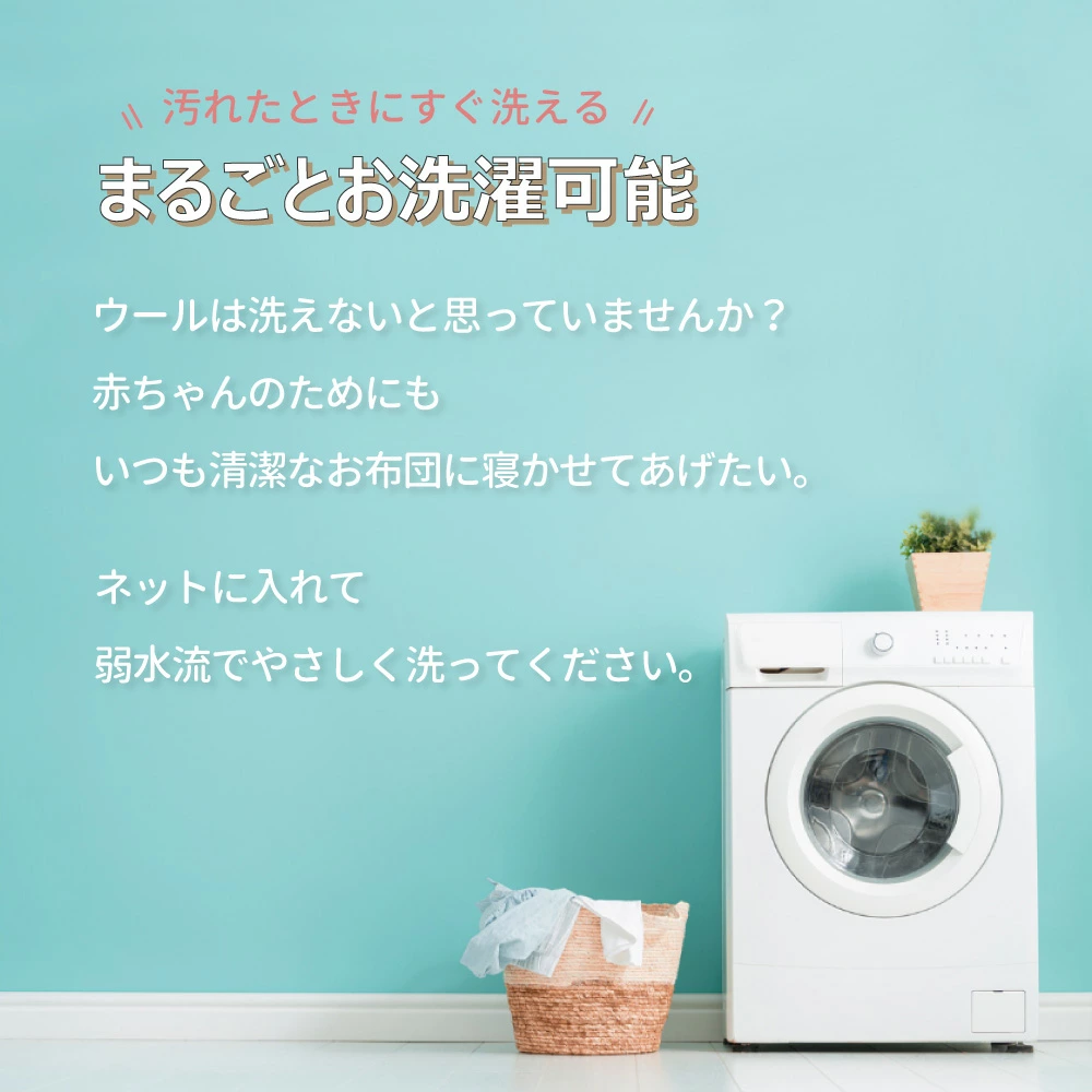 市場でもめずらしい「洗える」ウールのお布団です。化学繊維なら洗えるけれど、お子様にはやっぱり優しい素材を使ってあげたいというかたのために、ウォッシャブル仕様でお作りしました。