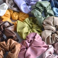 落ち着いたカラーと程よい光沢感が大人っぽいフェイクレザーシュシュ。