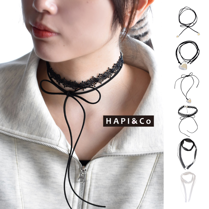 タイプサイズ:ミニダブルハート 長さ約124cm(ハートモチーフ約1.5cm×1.5cm)、〈ショートシングルハート 長さ約83cm、ロングシングルハート 長さ約145cm (ハートモチーフ約3.0cm×3.0cm)〉、レースリボンチョーカー 長さ約32cm+アジャスター約5cm ひも片側約47cm、レースコードブラック・レースコードホワイト レース約144cm、ひも約148cm