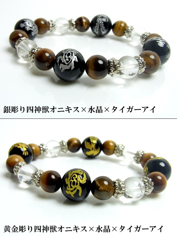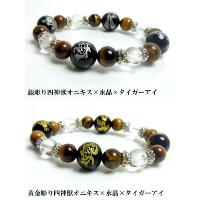 運気上昇 黄金彫りブラックオニキス 四神獣 パワーストーン ブレスレット 風水 メンズ ブラックオニキスに黄金色で彫られた四神獣、玄武・白虎・青龍・朱雀、これらは 天の四方を司り東の青龍、北の玄武、南の朱雀、西の白虎と言われ この四匹の揃う形は風水で最も理想的な配置とされ、『四神相応』と呼びます。 パワーストーンと組み合わせることによってさらなる運気を強力に呼び込みます。 オニキスに彫られた芸術的な彫刻はまさに職人技! 黄金色は金運上昇と深く関係し、金運アップの相乗効果をもたらします。 ブラックオニキスの黒に黄金の四神が美しく浮かび上がるデザインは 視覚的にも魅力です。 最強のパワーストーンブレスレット。 不景気の強い味方のブレスレットは1本あって損はなし! おすすめのブレスレットです。 □サイズ 内径:約18cm(サイズ・メンズフリー) □素材 パワーストーン:ブラックオニキス・水晶・タイガーアイ |