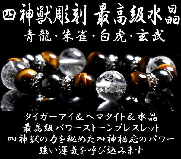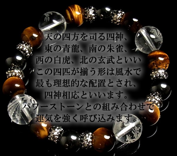 パワーストーン ブレスレット 天然石 水晶彫刻 四神獣 風水 金運アップ タイガーアイ メンズ ブレスレット 運気上昇 四神 人気 メンズ ブレスレット パワーストーン AAAランク以上の高品質水晶に彫られた四神獣、玄武・白虎・青龍・朱雀、これらは 天の四方を司り東の青龍、北の玄武、南の朱雀、西の白虎と言われ この四匹の揃う形は風水で最も理想的な配置とされ、『四神相応』と呼びます。 パワーストーンと組み合わせることによってさらなる運気を強力に呼び込みます。 水晶に彫られた芸術的な彫刻はまさに職人技! 一つ一つ丁寧に施された仕事が熟練の技を感じさせるブレスレット。 最強のパワーストーンメンズブレスレット。 不景気の強い味方のブレスレットは1本あって損はなし! おすすめのブレスレットです。 □サイズ 内径:約18cm(サイズ・メンズフリー) タイガーアイ一粒:約10mm ヘマタイト:約10mm 水晶:約12mm □素材 パワーストーン:水晶・タイガーアイ・ヘマタイト |