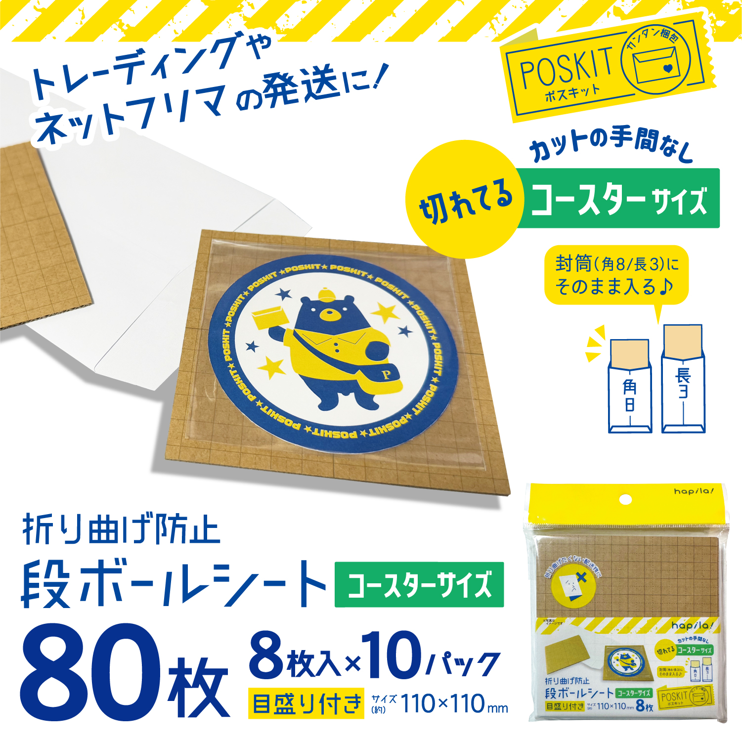 折り曲げ防止段ボールシート コースターサイズ 80枚(8枚入×10) 110×110mm 厚さ約1mm 目盛り付き ましかくフォト ハピラ PSKDBSSQ