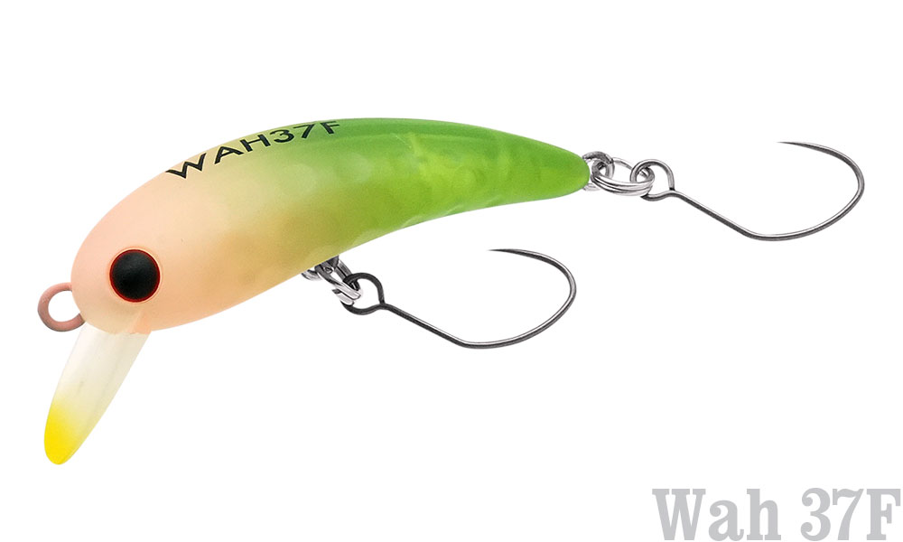 Wah 37F全長:37mm重量:2.3gタイプ:フローティング / 10cmペレットを捕食する管釣りトラウトの習性ならではの表層特化型クランク。 早巻きでサブサーフェスをハイピッチウォブリングするアクションは、高活性から中活性のトラウト相手にとても楽しい釣りが出来ます。 またロッドを立ててゆっくりリトリーブすると、その浮力を活かして表層をトップウォーターのように首振りアクションしてくれます。この表層アクションは、低活性ではあるものの表層を意識していまいちくって来ない管釣りトラウトのスイッチを入れてくれます。