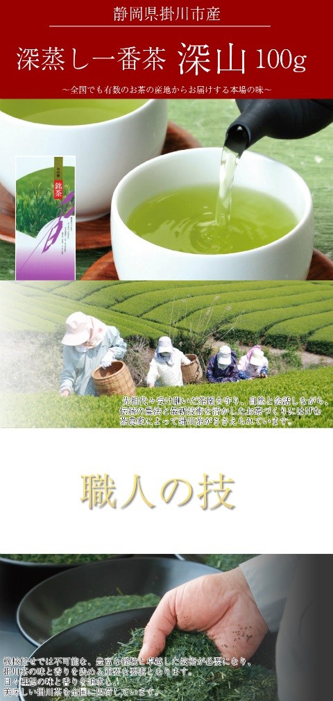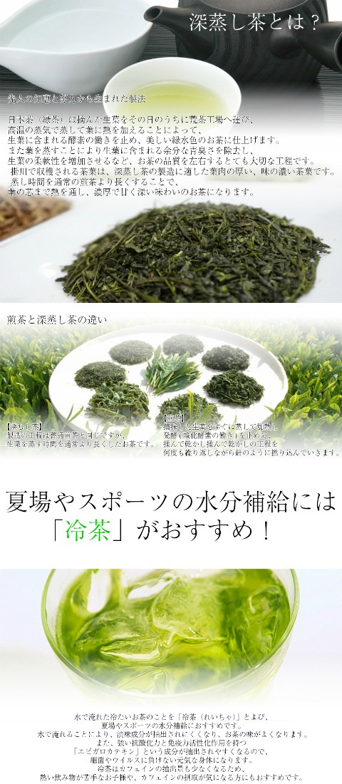 深蒸し茶は、通常のお茶よりも長い時間、深く蒸すことで葉の芯まで熱を通し、濃厚で甘く深い味わいのお茶です。掛川は、お茶の本場「静岡県」の中でも屈指の茶産地として知られ、全国トップクラスの荒茶生産量を誇り、穏やかな気候、適度な雨量といった、茶栽培にいい条件がそろった、自然豊かな地です。品質の高さも有名で、多くの賞を受賞し、名実共に認められる深蒸し茶の里です。いつもより少しだけ贅沢に、静岡県掛川産深蒸し茶をぜお試しください。