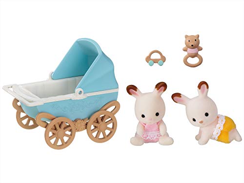 ・ショコラウサギのふたごちゃんのお人形、さわやかな水色のうば車とふたつの赤ちゃん用おもちゃのセットです。