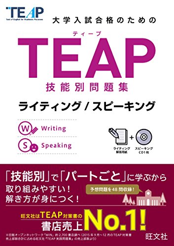受験生待望の技能別問題集が登場! TEAPの4技能(リーディング/リスニング/ライティング/スピーキング)のうち、 ライティング/スピーキングの2技能を集中的に演習する問題集です。 パートごとにまずは例題で問題形式と解き方を確認し、 その後、同じ形式のオリジナル問題を8セット解く構成になっています。 付属CDにはスピーキングのすべての問題音声と解答例音声を収録しています。 ★CDを使って実際に発話することでスピーキング練習に取り組めます。 問題形式ごとに対策ができるので、 「どんな問題が出るの」「TEAP問題の解き方にまだ慣れない…」 と不安を感じている人にもおすすめです。 === ※本書の音声は、旺文社リスニングアプリ「英語の友」でもお聞きいただけます。詳しくは、公式ウェブサイト(英語の友で検索! )をご覧ください。 ~主なTEAP採用大学~ 上智大学、立教大学、中央大学、青山学院大学、獨協大学、東京理科大学、筑波大学、明治大学、早稲田大学、学習院大学、 明治学院大学、法政大学、駒澤大学、中京大学、南山大学、関西学院大学、立命館大学、九州大学 ほか ※公益財団法人日本