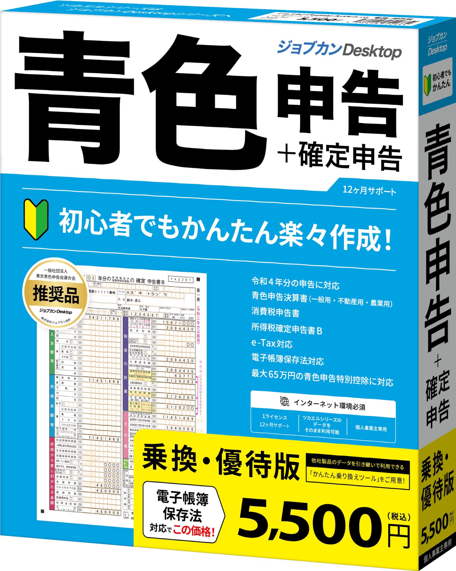 【乗換の方限定】お得な「ジョブカンDesktop青色申告」の【乗換・優待版】です。 他社確定申告ソフトから買い替えご検討の方や「ツカエル青色申告旧シリーズ」ご利用の方にもご利用いただけます。