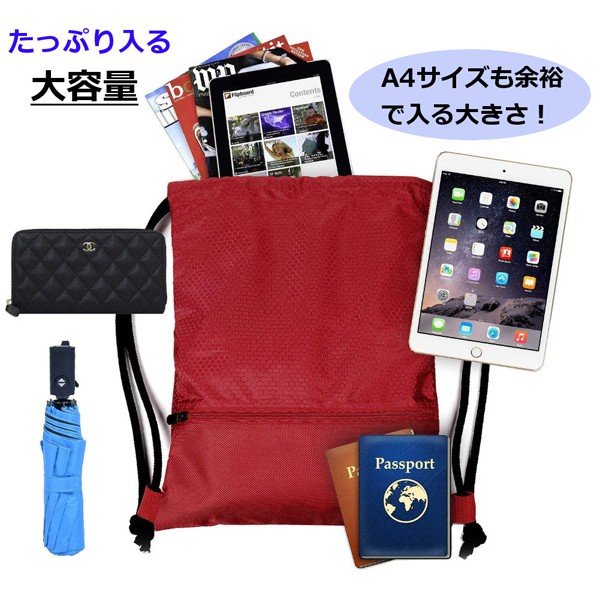 ・巾着袋タイプのナップサックです。A4サイズのノートもゆっくり入るほか、スポーツバッグとして着替えやスポーツ用品の持ち運びにもピッタリな大容量!大きく開く間口で物の出し入れがスムーズで、サッと背負える手軽なリュックです。