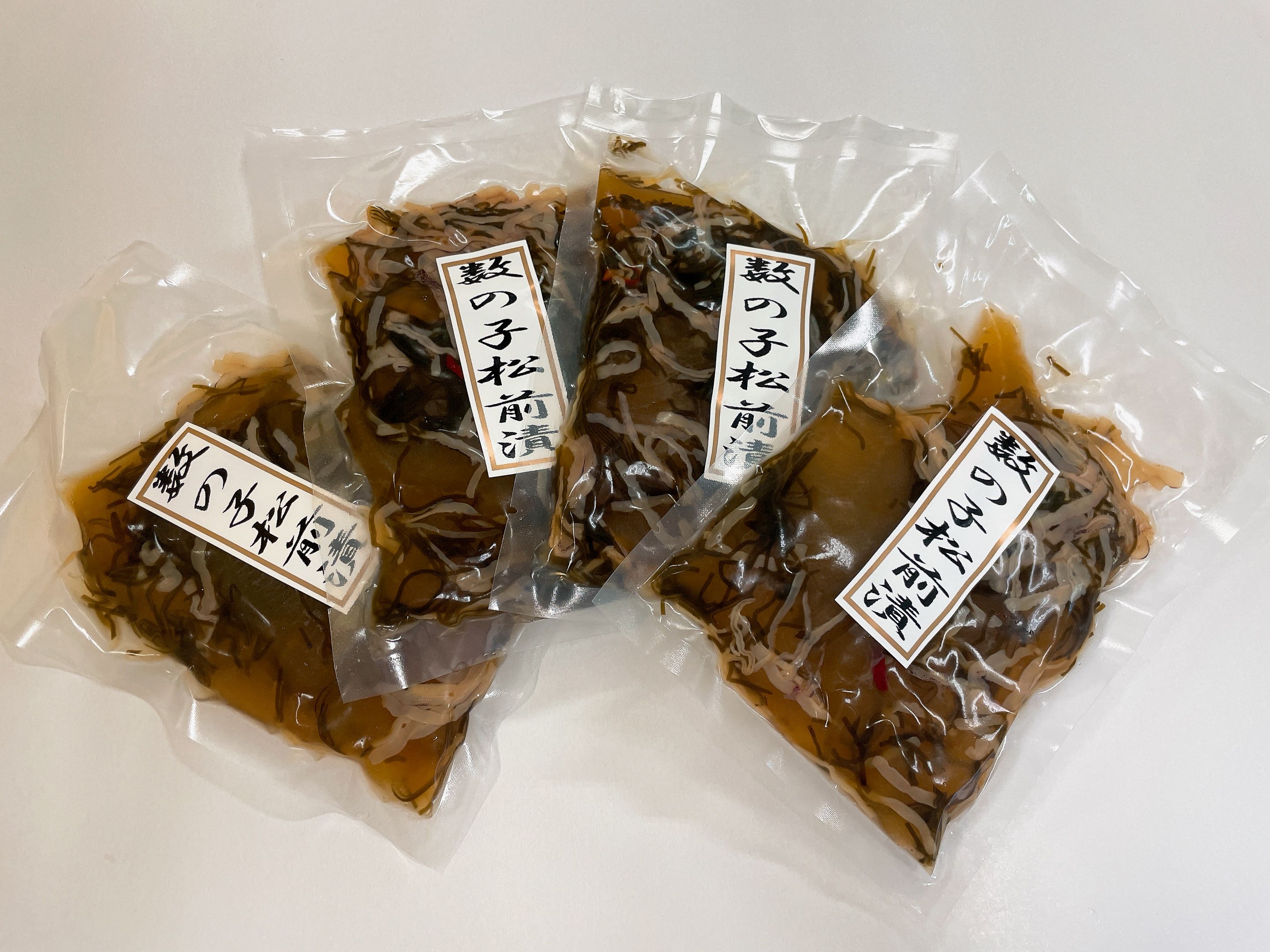 数の子が70%入った松前漬けの180gが4袋入ったセットです。