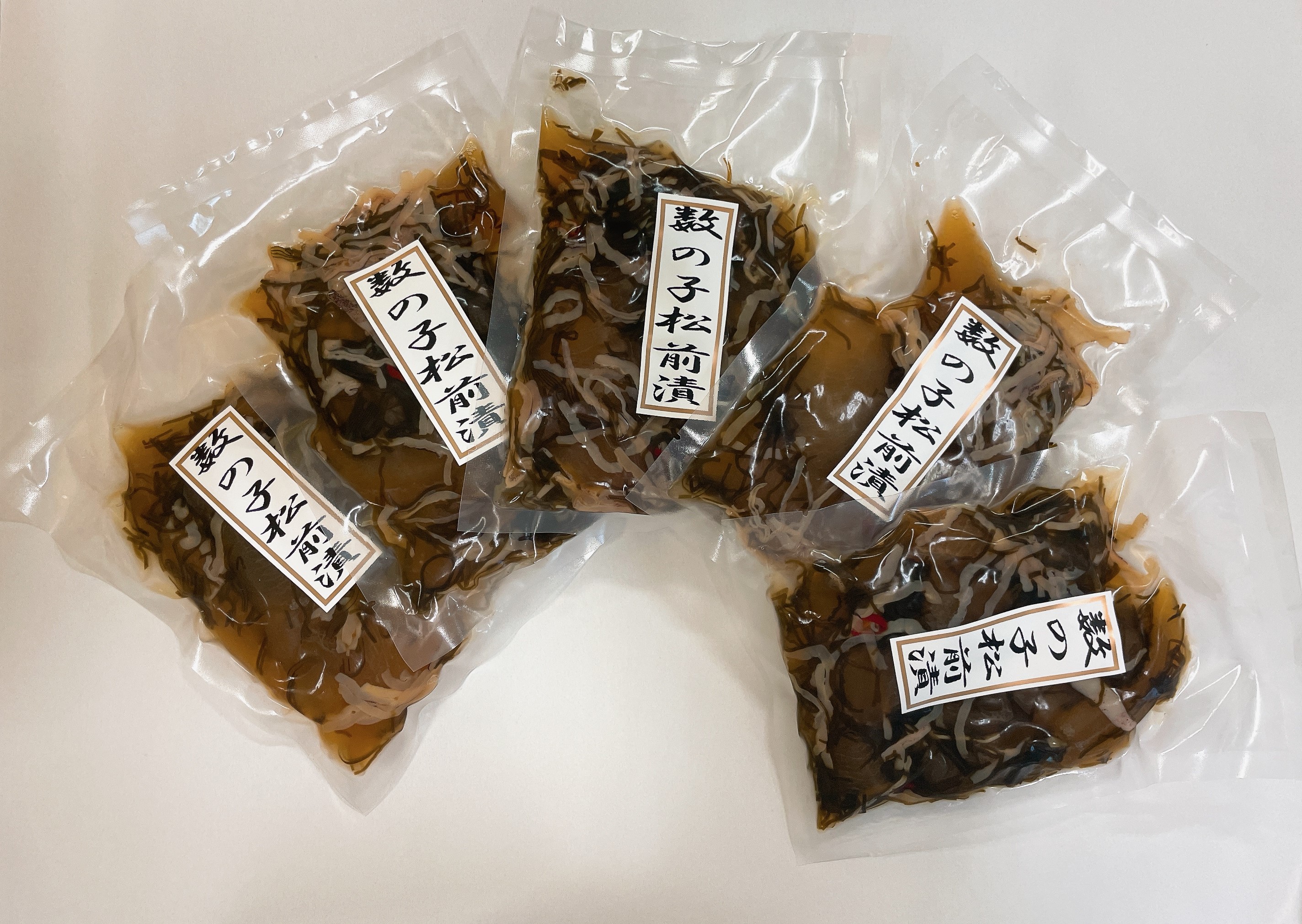 数の子が70%入った松前漬けの180gが5袋入ったセットです。