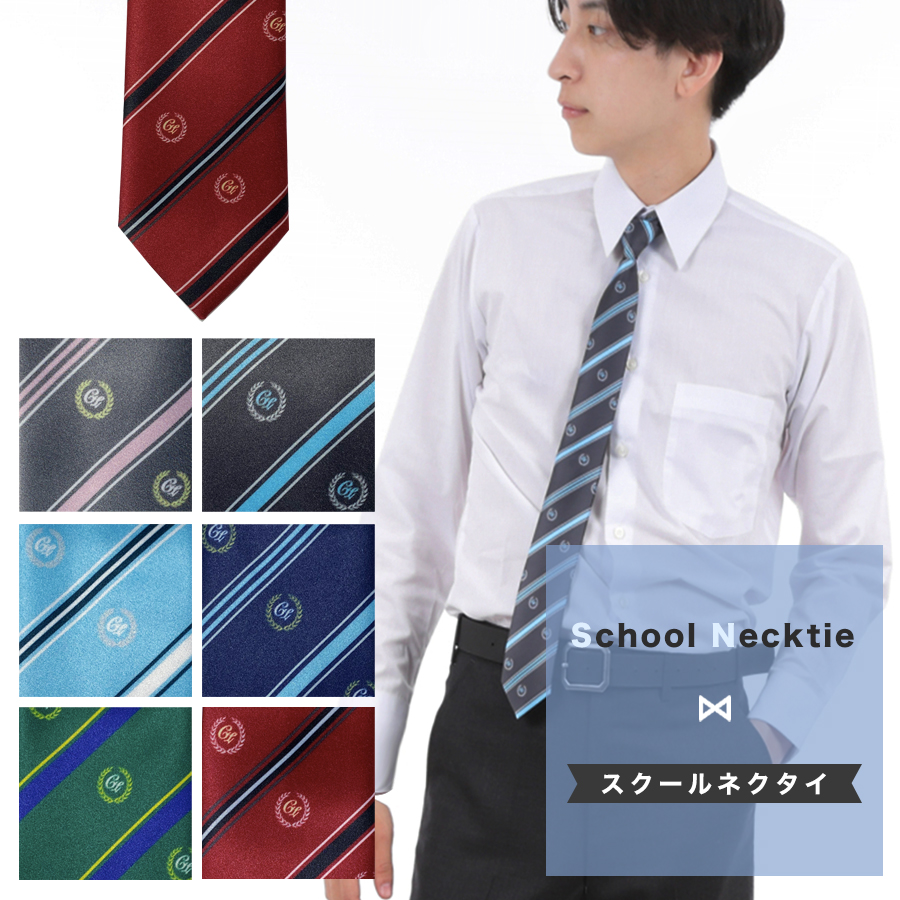 スクールネクタイ 男女兼用 ストライプ エンブレム柄 スリム 制服 学生 中学校 高校生 学校 コスプレ 文化祭 紺 赤 緑 青 水色