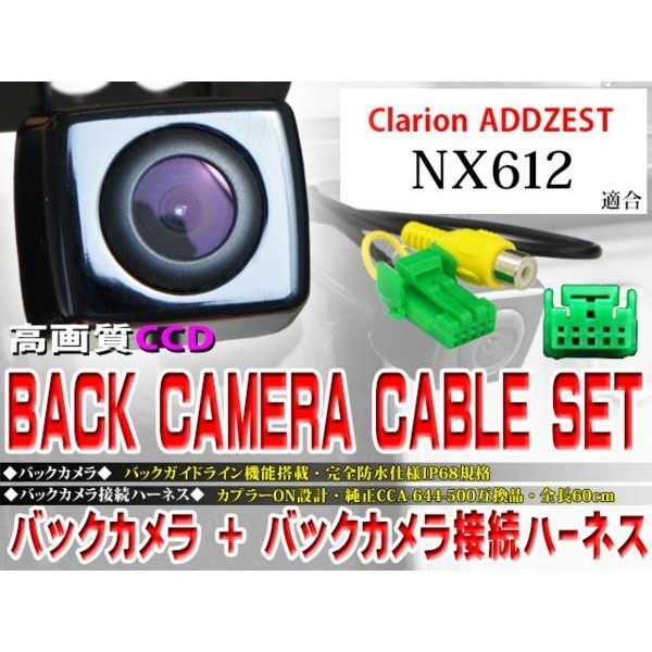 当商品をご覧いただき、誠にありがとうございます。 | 商 品 詳 細 | | セット内容 | バックカメラ変換ハーネス(純正CCA-644-500互換品:60cm)×1本 取り付けビス×2 バックカメラ本体×1 電源ケーブル×1 (68cm) 映像電源ケーブル×1(6m) | | 機種色 | 黒 | | イメージセンサー | 高画質カラーセンサー搭載 | | 映像形式 | NTSC | | 有効画素数 | 300000ピクセル | | 水平解像度 | 420TV本 | | 動作電圧 | DC12V | | 仕様 | 広角170℃ バックガイドライン付き 防水・防塵対応 | | 備考 | CMOSカメラに比べCCDカメラは画質、解像度が断然すぐれ夜間での使用や昼間でも、画質の違いがわかるほどの見やすさです。 角度調整可能でお好きな視点に合わせられます。 | 販売にあたり、自社で装着、使用テストしたのちに商品化にいたりますので、安心してご使用いただけます。 下記に一部の適合記載しておりますので、ご確認くださいませ。 | アゼスト クラリオン バックカメラハーネス 適合表 | | 2013年 | | NX713 | NX613 | NX513 | | 2012年 | | NX612 | NX712 | NX810 | | NX811 | MAX809 | | | 2011年 | | NX111 | NX11 | NX711 | | 2010年 | | NX110 | NX310 | NX710 | | NX810 | NX610W | | | 2009年 | | NX209 | NX309 | NX609 | | NX809 | MAX685DT | | | 2008年 | | NX208 | NX308 | NX708 | | NX808 | MAX575 | MAX675 | | MAX685 | MAX675DT | | | | 2007年 | | MAX7700 | MAX8700DT | MAX8750DT | | MAX9700DT | MAX9750DT | MAX570 | | MAX670 | | | | 2006年 | | MAX560HD | MAX760HD | MAX760DTB | | MAX860HD | MAX960HD | TSZ860 | | 2005年 | | MAX550HD | MAX750HD | MAX850HD | | MAX950HD |