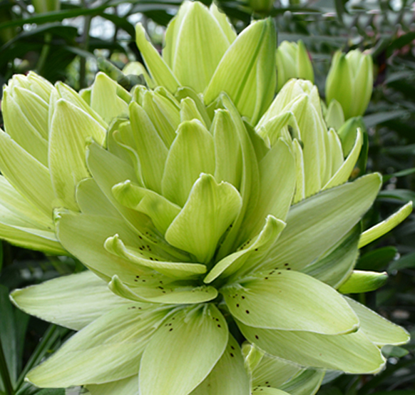 一本の茎に複数の花が咲くリリー 'ミステリー・ドリーム' は、淡い緑色の花びらを持ち、一部は深紅で繊細にしまっているものもあり、中央に深紫の花びらのサプライズがあるものもあります。花は開くのに時間がかかり、プロセスの各段階で楽しむ機会がたっぷりあります!<br />