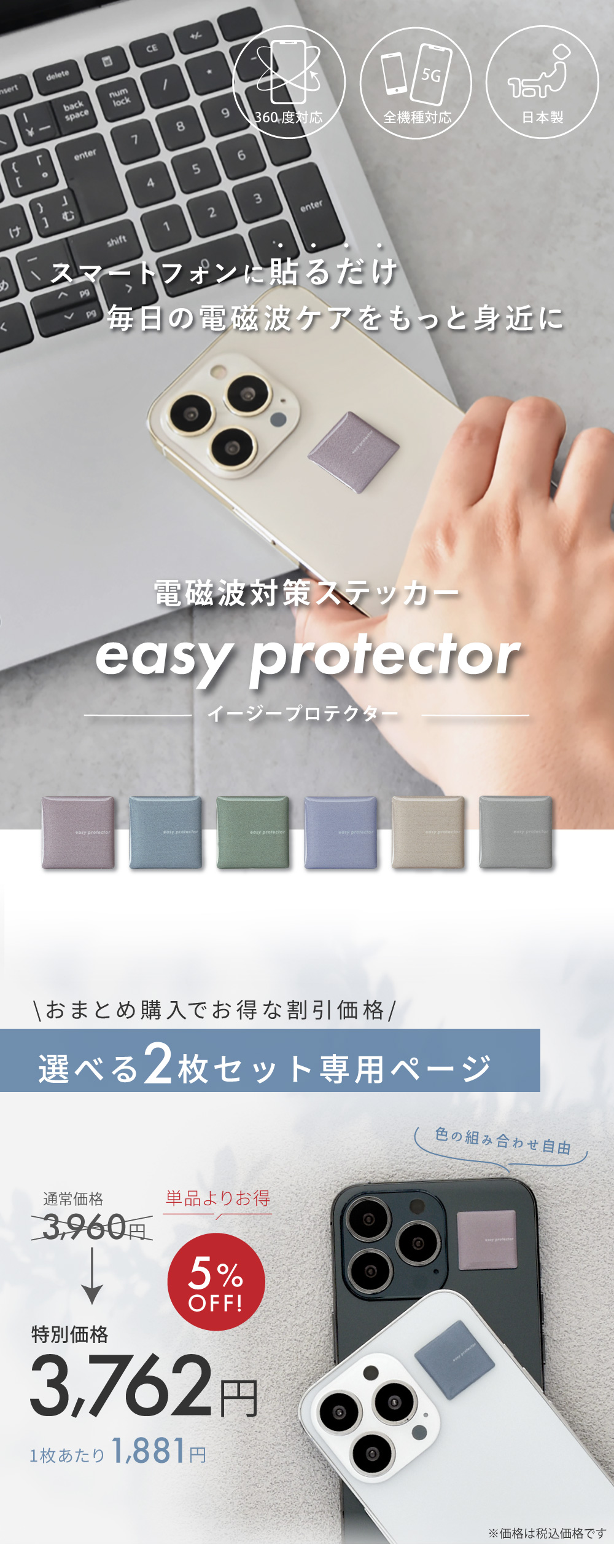 【商品名】easy protector Ash Tone 選べる2枚セット 貼るだけ簡単、電磁波対策ステッカー