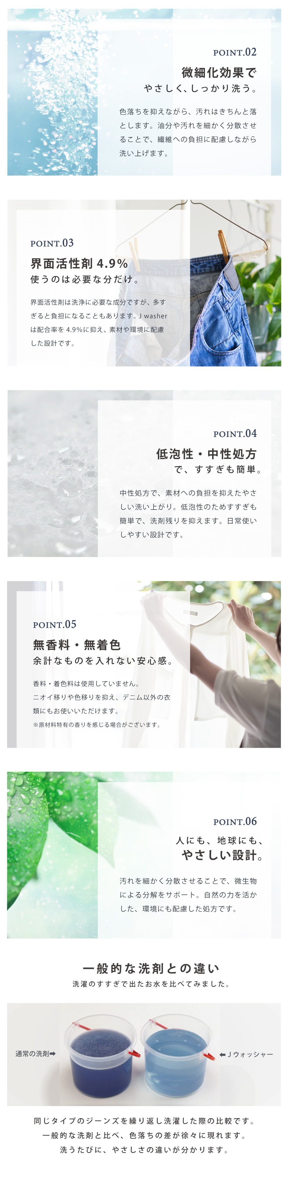 【商品特性】蛍光増白剤不使用。デニム特有の色味や風合いを大切にしながら、やさしく洗い上げます。お気に入りの一本を長く楽しみたい方におすすめの専用洗剤です。
