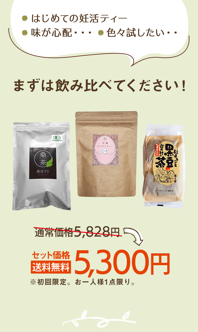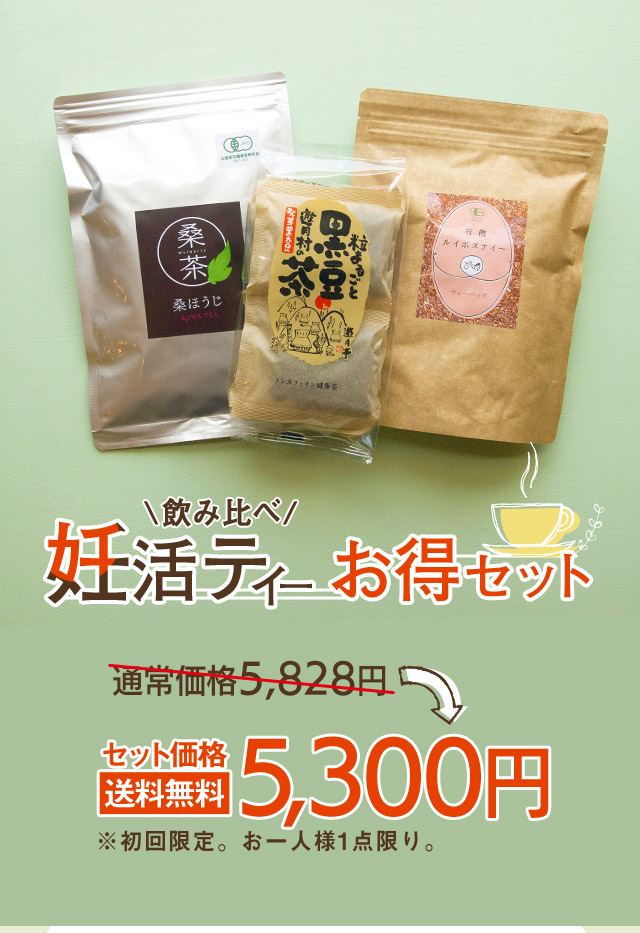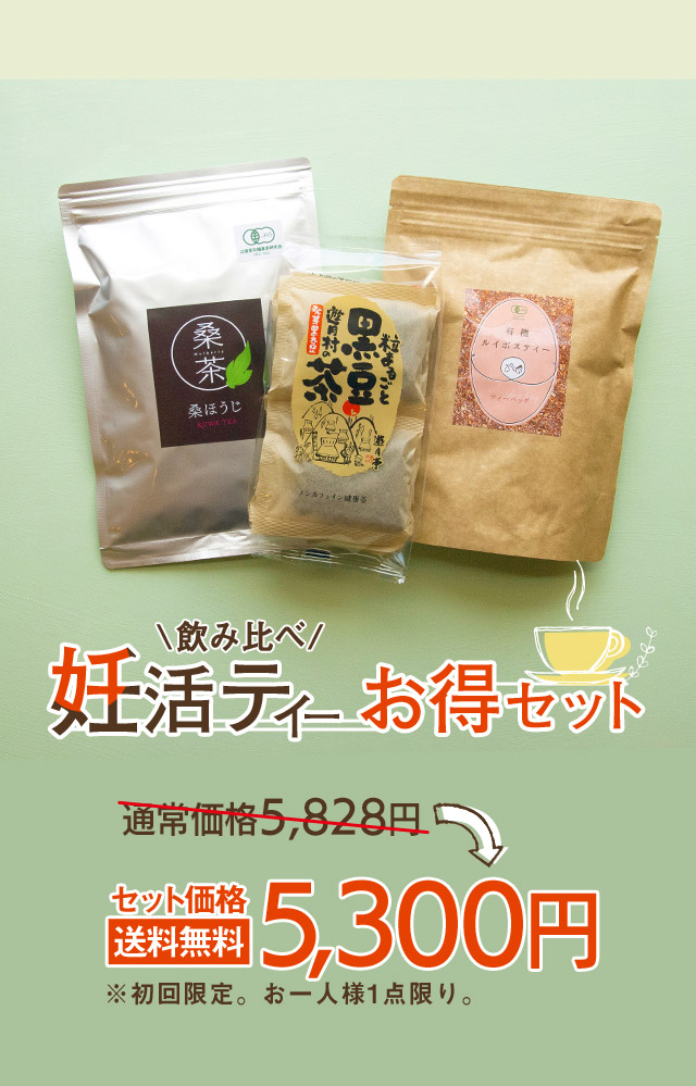 ![]() ルイボスティー | ![]() 桑の葉ほうじ茶 | ![]() 発芽黒豆茶 |