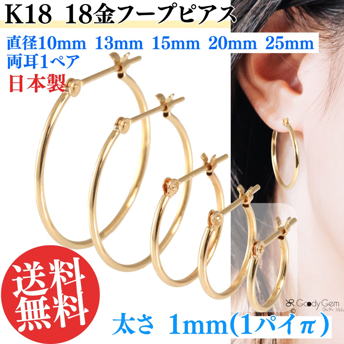 K18 18金 スナップピアス フープピアス 太さ 1mm 1π パイ直径25mm 20mm 15mm 13mm 10mm アクセサリー レディース メンズ プレゼント 金属アレルギー対応