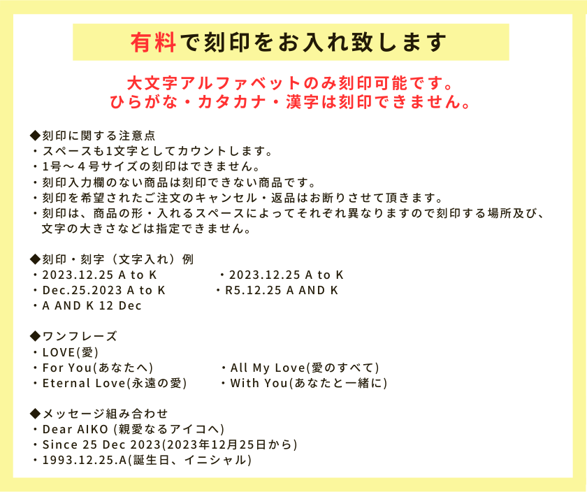 ・刻印は、商品の形・入れるスペースによってそれぞれ異なりますので刻印する場所及び、文字の大きさなどは指定できません。