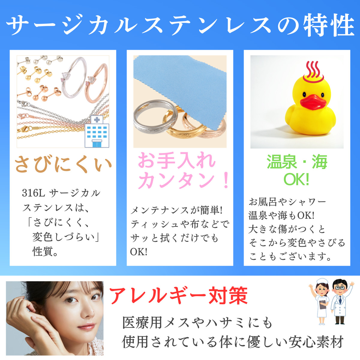 汗や水に強くお肌に優しい。金属アレルギーの方も安心してつけられます。