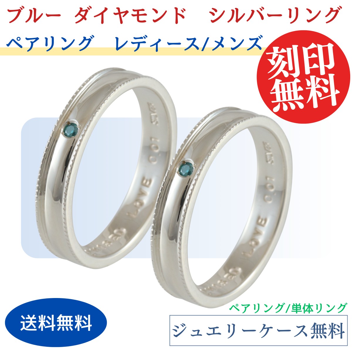 ペア リング 指輪 シルバー SILVER 925 天然石 ブルー ダイヤモンド 2本 セット 銀製品 光沢 シンプル ケース付き 文字 刻印 無料 ネームリング 恋人
