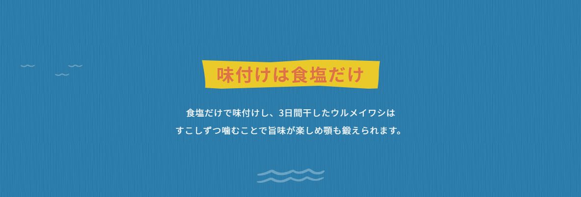 食塩だけで味付けし、3日間干したウルメイワシは、少しずつ噛むことで旨味が楽しめ、顎が鍛えられます。