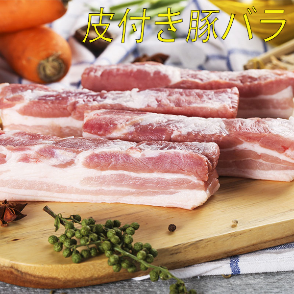 皮付きバラ肉カット。脂身の厚みは個体差がございますので、赤身との比率につきましては脂身の多いものもございます、何卒ご了承ください。豚の角煮に一番おすすめします。とろとろに煮あがって歯切れの良い柔らかな食感です。薄いスライスを切て、焼肉も美味しいですよ。