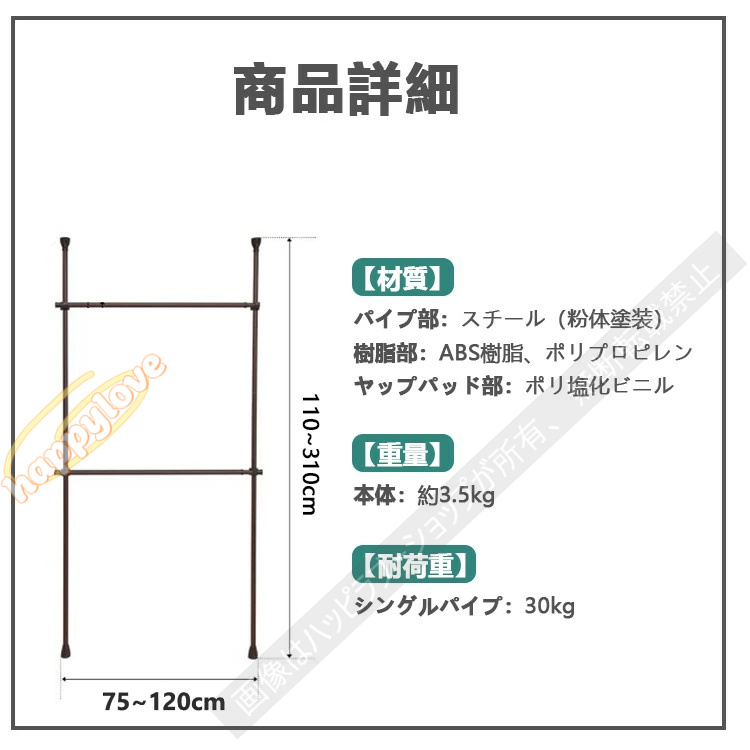 耐荷重:60kg(ハンガーパイプ1本当たり30kg※伸縮していないの耐荷重です)
