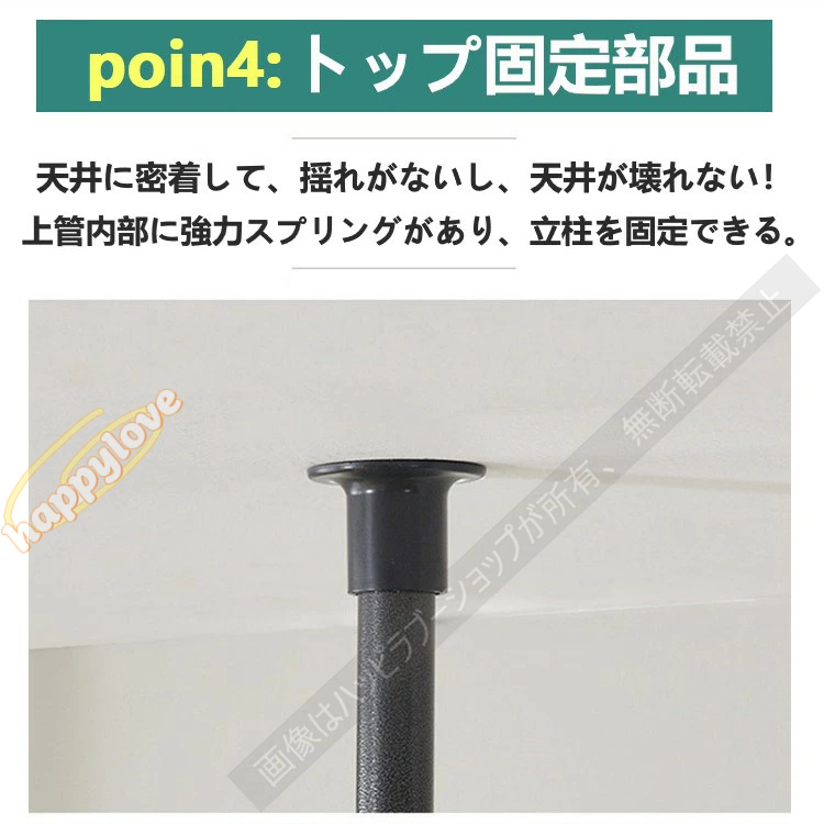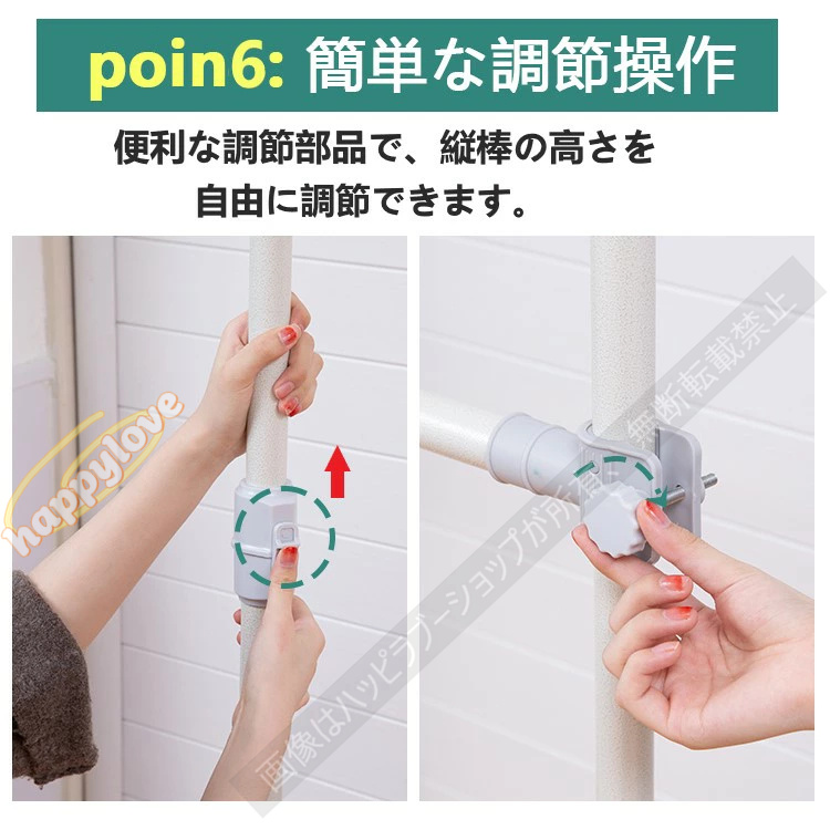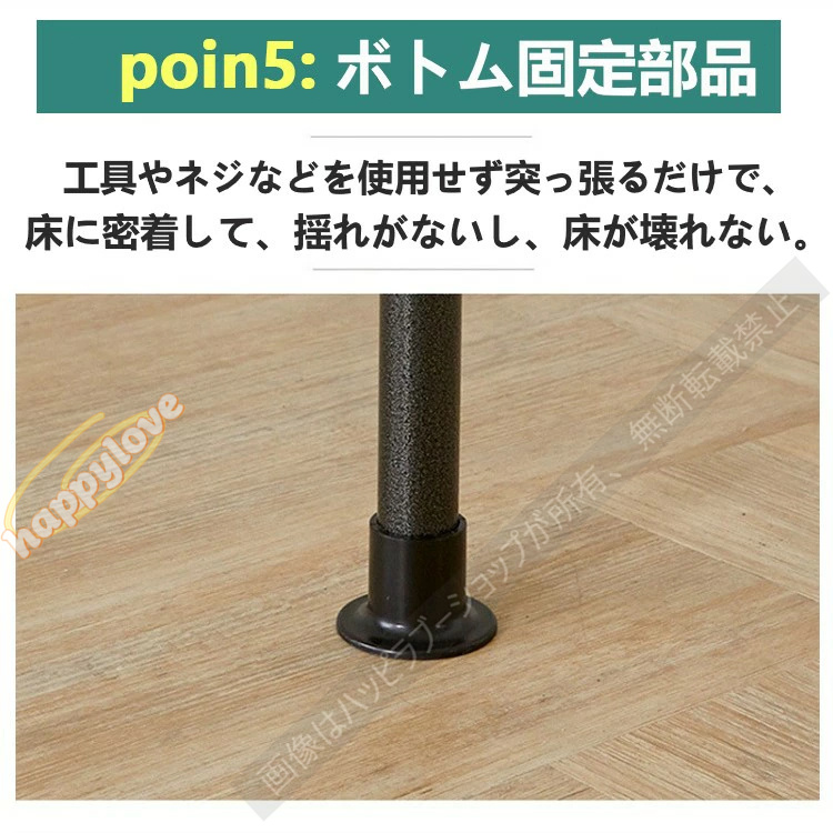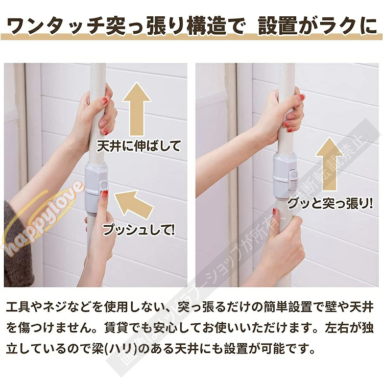 ※設置場所を柔軟に選べる突っ張り固定式、スプリング圧縮式で安定性抜群。