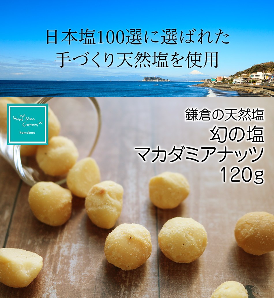 当店自慢の幻の塩ナッツは、美味しいナッツをより美味しくする為に、こだわりの鎌倉天然塩を使用致しました。このお塩は、日本の塩100選にも選ばれた逸品です。作り手のこだわりから、手間のかかる薪窯で炊き上げたお塩で、この製法で出来上がるお塩は、ミネラルたっぷり含くみ、優しくて甘みがあるお味です。絶妙な塩加減で、ナッツの甘み・香りを引き立てくれます。是非、一度ご賞味下さい。