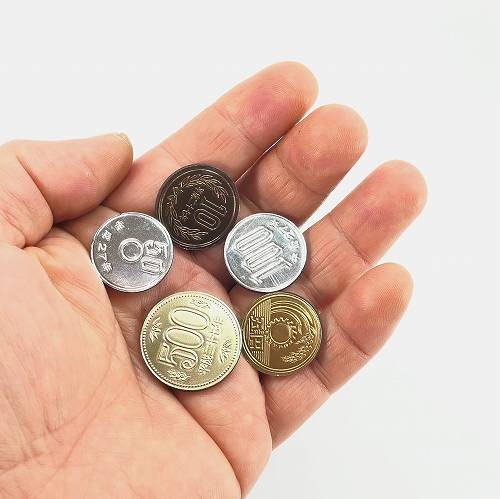 500円玉、100円玉、50円玉、10円玉、5円玉、それぞれひとつずつで1セットが10セットまとめての販売です。