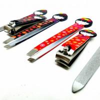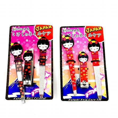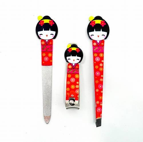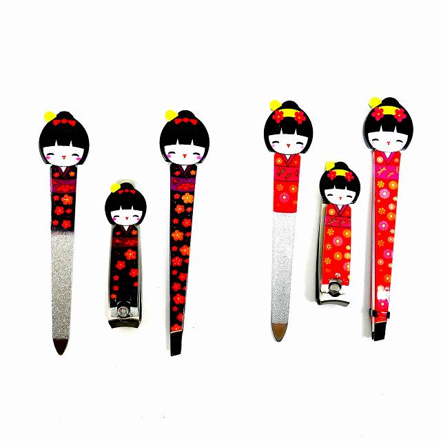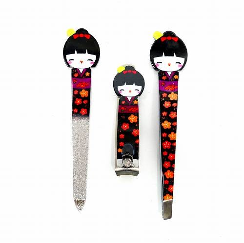 爪切り 爪やすり 毛抜 3点セットのグルーミングキット 爪切りセットが2セットです。 お土産屋さんでも販売されております。こけし風にそして着物を纏った柄です。色違いの2セットで黒とオレンジ柄です。在庫限りの安価にて提供しております。