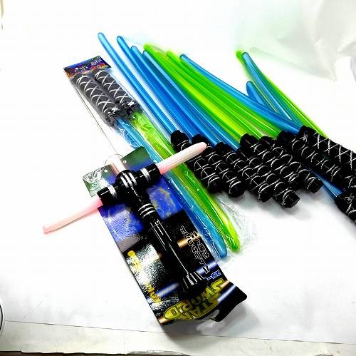 訳あり展示品です。光る刀剣プラスチック製約15本まとめて。 傷あり、パッケージなしなど少し劣化したのもあります。また中には電池切れのもあります。 中には音切れのもあると思われます。 あらかじめご了承ください。 光って、音があり。バトルなサウンドソードです。 先がまるいので安全性に考慮した商品となってますが 子供を遊ばせるときは親が見ているところで注意しながらお願い致します。 柄の末端部分がジョイントできるようになってますので、カチッとするまで差し込んで 合体二刀流をもお楽しみください。