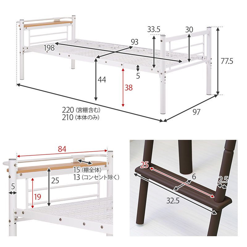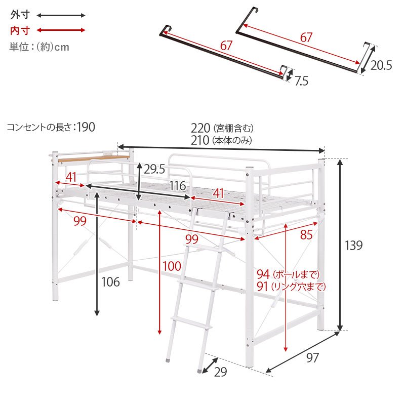 システムベッド 白 ベッド下収納 フレームのみ ロータイプ 茶 棚付き ロフトベッド ブラウン 耐荷重100kg ホワイト 幅97×220×139/77.5 ハイタイプベッド おしゃれ