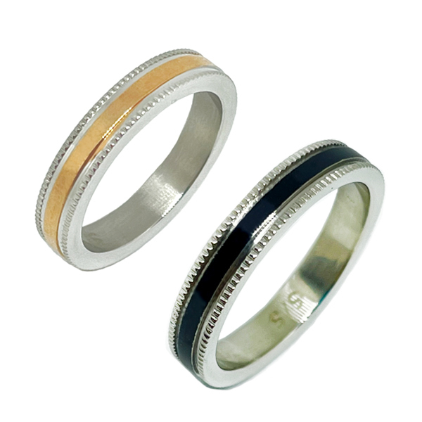 大人気 ペア ステンレスリング ミル打ち ブラック&ピンク マリッジリング