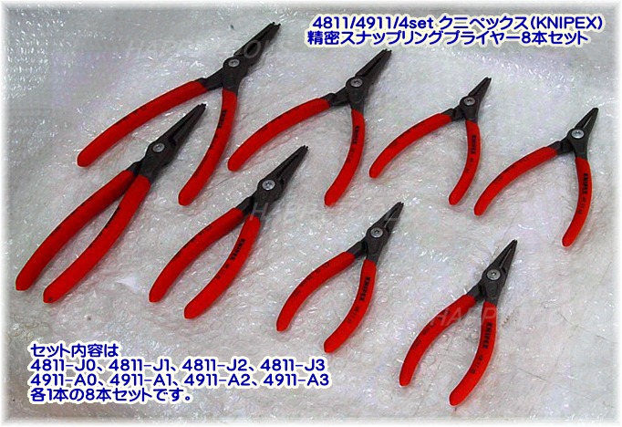 在庫有!インボイス制度対応!!4811/4911/4set クニペックスの精密スナップリングプライヤーセットのご案内です。使用頻度の高い軸用、穴用精密スナップリングプライヤー8本セットです。セット内容は4811−J0 穴用スナップリングプライヤー ストレートヘッド 8-13mm4811−J1 穴用スナップリングプライヤー ストレートヘッド 12-25mm4811−J2 穴用スナップリングプライヤー ストレートヘッド 19-60mm4811−J3 穴用スナップリングプライヤー ストレートヘッド 40-100mm4911−A0 軸用スナップリングプライヤー ストレートヘッド 3-10mm4911−A1 軸用スナップリングプライヤー ストレートヘッド 10-25mm4911−A2 軸用スナップリングプライヤー ストレートヘッド 19-60mm4911−A3 軸用スナップリングプライヤー ストレートヘッド 40-100mm上記プライヤーが各1本のセットです。