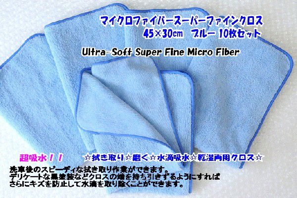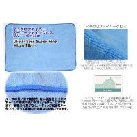 ☆☆ハッピーツール大特価!!☆☆ マイクロファイバースーパーファインクロスのご案内です。 乾湿両用、サイズ:45×30cm、カラー:ブルー、素材:ポリエステル80% マイクロポリアミド20% デリケートな車美装に使う立場から、お勧めする超極細繊維クロスです。 コーティング、ワックスの拭き取り〜ガラス清掃、各種お手入れ、クリーニングに毛羽落ちがなくトップクラスの 柔らかな肌触りと肉厚のある繊維は素材に優しく綺麗な仕上げが可能となる、マイクロファイバークロスです。 また吸水効果がとっても優れており、大切な愛車のカーケアクロスとして多用途に有効にお使いいただけます。 コーナーの四隅はアールカットで仕上げたデザインです。 Ultra-Soft Super Fineシリーズのマイクロファイバークロスはループ裏表の長さが違います。 表面と裏面のマイクロファイバーのループの長さを異なる2面仕様にすることで使用する場所へのマッチング性が図れ、 使う方の好み等により使い分けができます。 ループ起毛が短い面は緻密で平織りセームのような高精度の拭き取りが可能にしたこだわりの製品です。 一般的なマイクロファイバーに比べ繊維密度が高く肉厚があり、クッション効果の働きで使用対象物に対し 優しく拭きあげることができます。(キズが付きにくい) (乾拭きの場合の使用例) ループの長い面で粗拭き、短い面を仕上げ用にすることで精度の高い拭きとりをすることができます。 毛羽の付着がなくコーティング拭き取り〜仕上げ、ガラス清掃など効率よくお使いできます。 今回ご紹介のレギュラーサイズ(45X30cm)での拭き取りの際には四つ折りにしてお使いいただきますと 素材の持つソフト感と肉厚感を最大に活かせることができます。 ◆マイクロファイバークロスの優れた特徴◆ 吸水力が抜群 綿に比べて約3倍程度の吸水量、吸水スピードがある。 超極細繊維(髪の毛の数百分の一)のミクロ繊維で、毛細管現象が活発。 素材であるポリエステル・マイクロポリアミドは本来は水は吸収する素材ではありませんが、マイクロファイバーは 多角形状の断面構造のミクロ繊維で形成されており、その繊維と繊維の間に多くの隙間ができています。 その隙間が毛細管現象の働きを活発にして、吸い込むと言うより、一時的に水を蓄えるという現象を起こします。 繊維構造が多角形状のエッジで頑固な汚れをかき出す。 (※洗剤を使わなくても汚れを落とす効果がある。) 特に頑固な汚れの場合には水拭きまたは少量の水を噴霧しお試しください。 ふわふわした柔らかな肌触りで使用する素材に優しく、拭いた後の毛羽も残らず繊維の耐久性も 非常に優れており経済的です。保湿性、通気性が良く、乾燥が速い。 耐久性に優れる。バクテリアが繁殖しにくい。綿素材に比べて軽く扱いやすい。 ◆マイクロファイバークロスの主な用途◆ 洗車後の水分の拭き取り、ワックスやコート剤の拭き取り、ガラスの油分、手垢落としクリーニング、 各種ツールのお手入れなどカーメンテナンス全般に。 ガラス製品全般、パソコン、テレビ、仏壇、楽器、ゴルフクラブ、キッチン〜シンク周り、食器拭き、 フローリング、家庭のお掃除全般、身体洗い〜吸水タオル、ペットのシャンプー後の水分の拭き取りなどに ・ハウスクリーニング〜ビルメンテナンス業務に ・店舗ショーケース、ガラス製品、看板等の汚れ、手垢等清掃に ・キッチン〜シンク周りの清掃、食器等の水分除去等に ・オフィス機器、液晶テレビ、プラズマなど電化製品、AV機器、携帯電話の清掃等に ・ハンドタオル、ピーリングタオル、美容タオルに ・その他、多用途にお使いいただけます。 ◆マイクロファイバー使用上の注意◆ 表面についている砂や固いゴミ汚れは落としてからご使用ください。 本品は汚れを掻き落とす力が強いので、特にプラスチック等を強く擦り過ぎないようにしてください。 お顔、お肌にお使いの場合は擦り過ぎに注意していただき、お使いの場合は自己責任でお願いします。 洗濯には中性洗剤、固形石鹸を使用し揉み洗いし、よく絞って乾燥させてください。 柔軟剤、漂白剤は使用しないでください。 ウルトラソフト、ブルーは食品衛生法の「食品、添加物等の規格基準」「おもちゃの製造基準準用」に基づいた 「日本科学繊維検査協会」の試験方法で繊維(縁取りの繊維)を含めての試験で着色料の溶出は 認められませんでしたが念の為に他の物、特に白淡色ものとは分けて洗濯してください。 使用後は良く洗い、十分に乾燥させて保管ください。 本品は特に柔らかな生地を使用しておりますが金箔、銀箔、うるし、メッキ、塗装など柔らかな素材への使用は 細かなキズを付けてしまう可能性がありますので目立たない所で確認してください。 廃棄は繊維ゴミとし各自治体の定める方法に従い処理をしてください。 火気付近での使用また放置しないでください。アイロンはかけないでください。 本品は用途以外にお使いにならな
