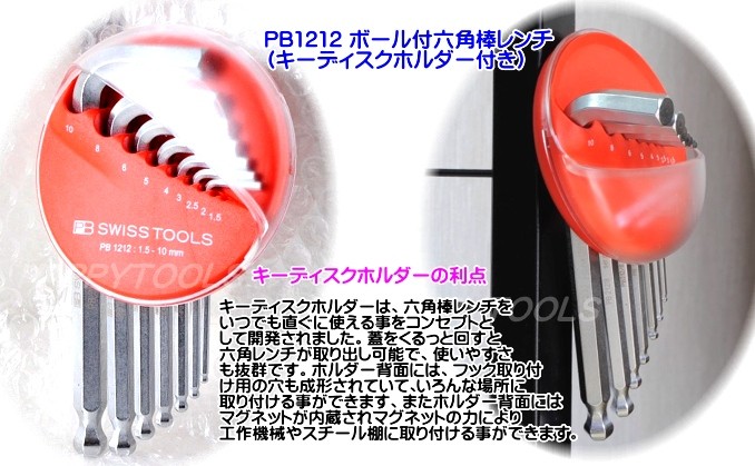 | 在庫有!代引発送不可!! ☆☆ハッピーツール大特価!注目商品!!☆☆ PB1212 PB SWISSTOOLS ボール付六角棒レンチセット(キーディスクホルダータイプ) スタンダード ボールポイントの六角レンチセットのご案内です。 ●ニッケルクロームメッキされており、耐錆性と長寿命を可能にしています。 ●エッジは軽く隅取りしてあり、レンチをたやすくネジ穴に差し込むことができます。 ●レンチには5桁の生産番号が記されており、この番号で原料段階の製造過程まで遡ることができます。 ●硬度はHRC59と大変高く、しかも強靭に作られているので、耐摩擦性、持久性に優れ、高トルクをかけることが できます。 ●精密に作られたボールポイントで角度のついたところのネジを回すことが可能です。 (斜め30°の角度までOK) セット内容は、1.5mm、2mm、2.5mm、3mm、4mm、5mm、6mm、8mm、10mmの9本組で キーディスクホルダーにセットされています。 PB社のキーディスクホルダーは、六角棒レンチをいつでも直ぐに使える事をコンセプトとして開発されました。 蓋をくるっと回すと六角レンチが取り出し可能で、使いやすさも抜群です。 ホルダー背面には、フック取り付け用の穴も成形されていて、いろんな場所に取り付ける事ができます。 またホルダー背面にはマグネットが内蔵されマグネットの力により工作機械やスチール棚に取り付ける事ができます。 ※表示価格はPB1212 1セットのお値段です。 ※ボール部では本締めできません。 ☆☆販売価格は消費税込みです。品物はもちろん新品です。送料は下記の通りです。☆☆ |