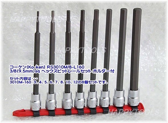 在庫有!インボイス制度対応!!RS3010M/8-L160 コーケン(Ko-ken) ロングのヘックスビットソケット8個組のご案内です。セット内容は・・・3010M-160−3、4、5、6、7、8、10、12の8個セットです。全長160mm、差込角3/8インチ(9.50mm)sqです。ホルダー付き。