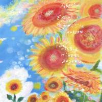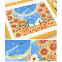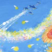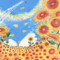 青空がとても似合う「ヒマワリ」。群れで咲き重なる姿は、まるで笑顔で応援をしてくれる人達の様。よく見ると丸いカタチをしたヒマワリや、遠くに見える翼のような雲、空に輝く光、勢いよく飛び立つ鳥たちなど、自然と心に力湧いてくるような一枚。ヒマワリ達の向く先には、きっと太陽が。今、目指す先にある大切なものと重なり、絵の中と外をあるはずの太陽の存在が繋げてくれる作品です。ヒマワリの好きな方にはもちろん、リビング・玄関のインテリアとしてもおすすめ。新たなスタートを迎える方、応援したい方、開店祝いや新築祝い、お誕生日等の贈り物としても喜んで頂けます。