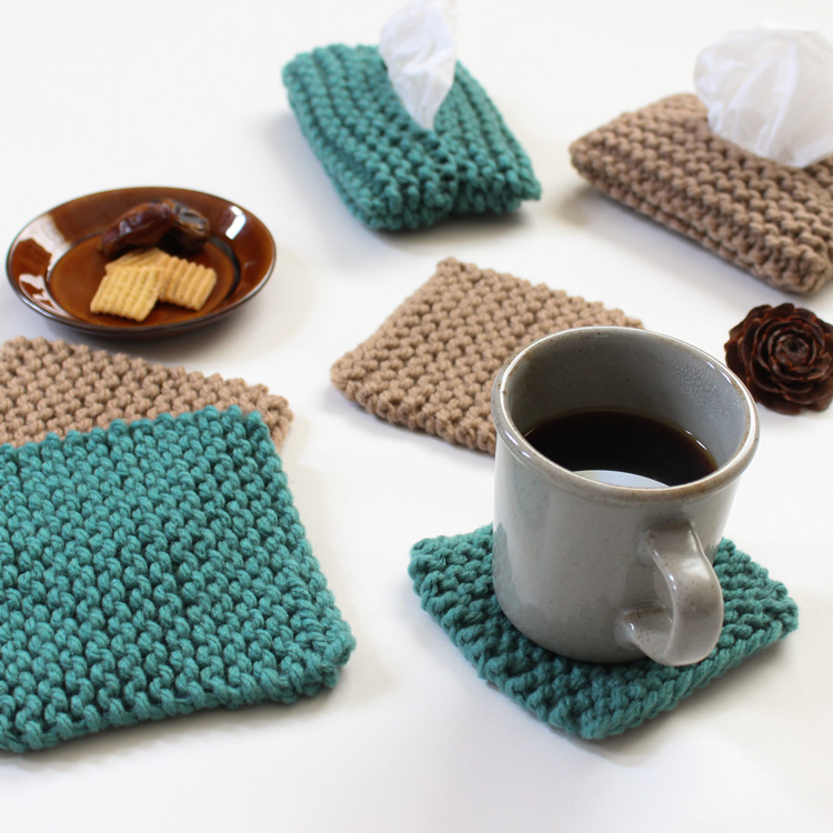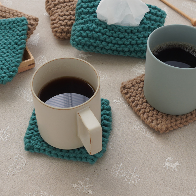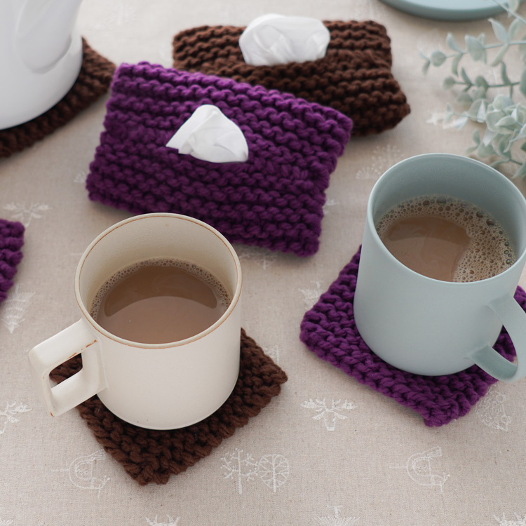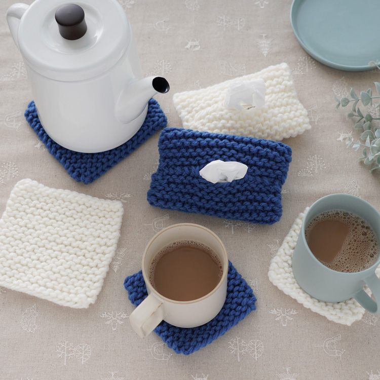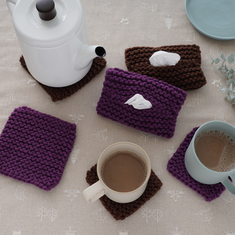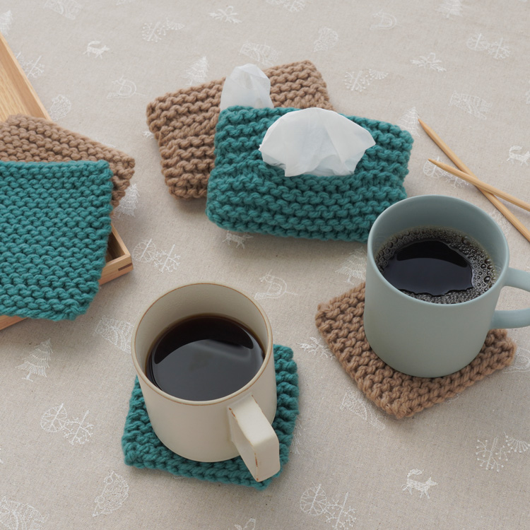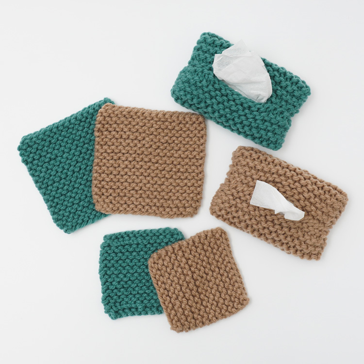 ガーター編みを練習しながらコースタータワシティッシュケースカバーの3種類の作品を編むことができます。