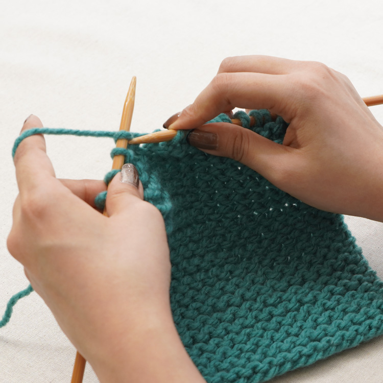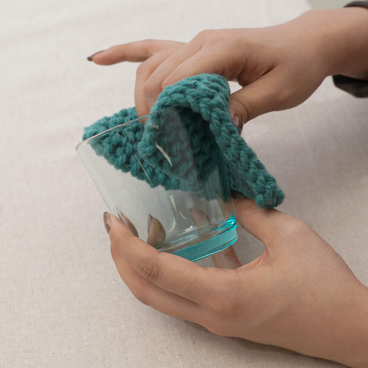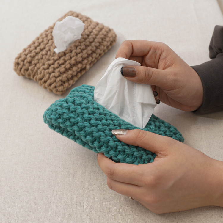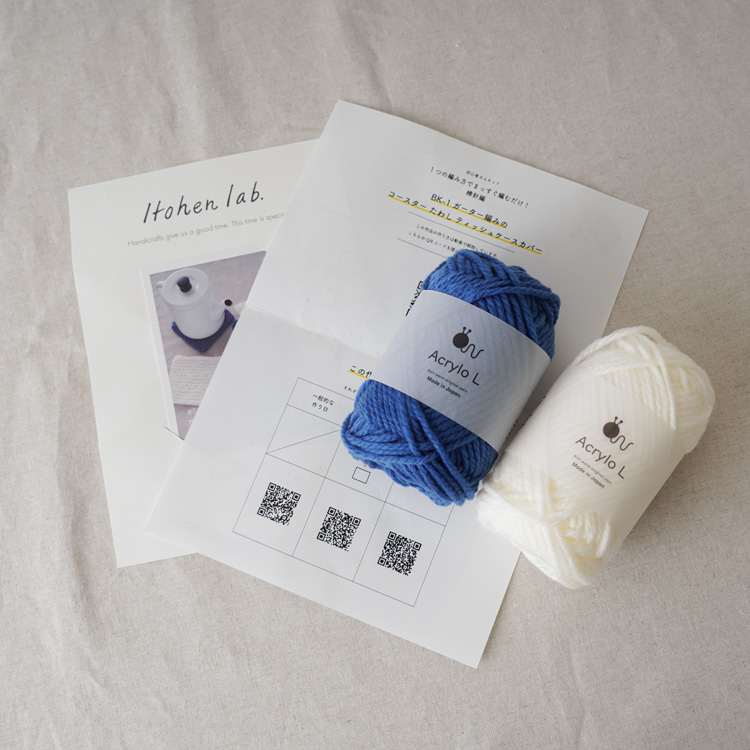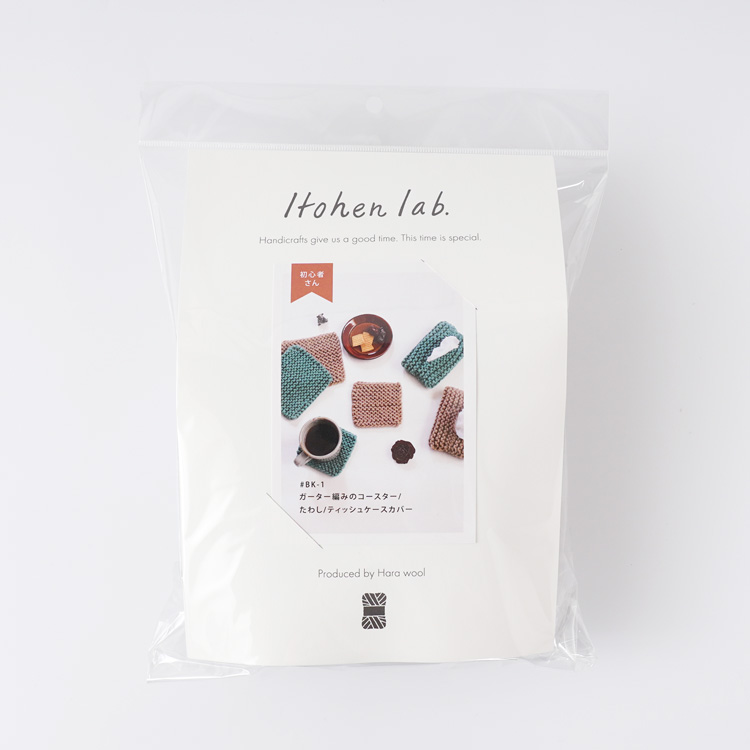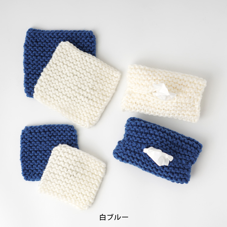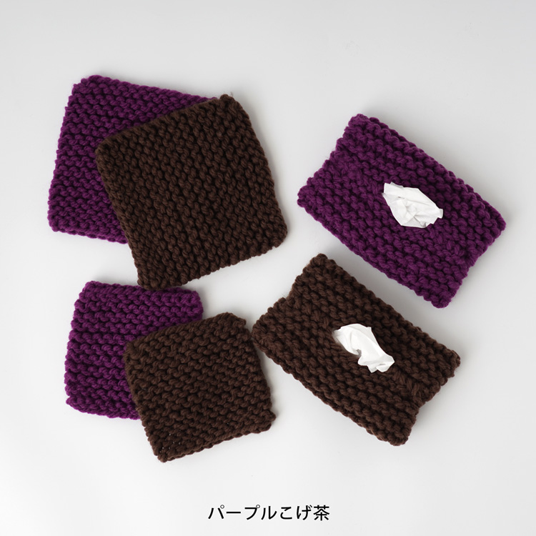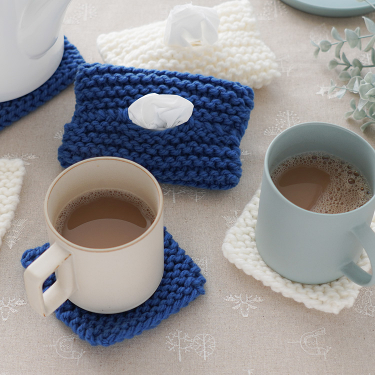 ガーター編みを練習しながらコースタータワシティッシュケースカバーの3種類の作品を編むことができます。