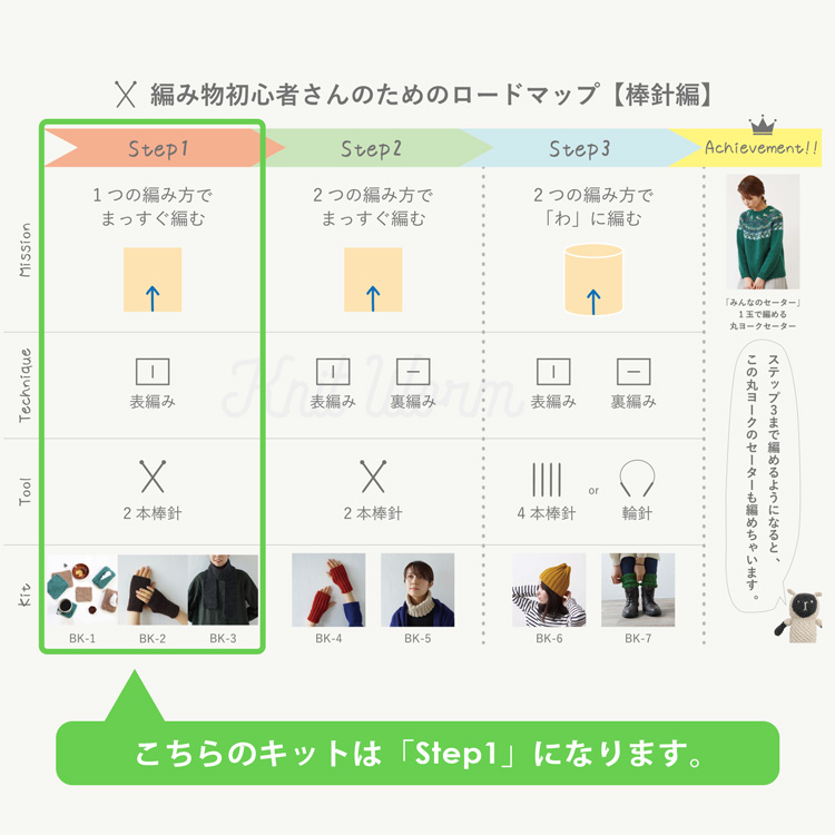 棒針初心者さん向けロードマップ、「ステップ1:1つの編み方でまっすぐ編む」シリーズのキットです。