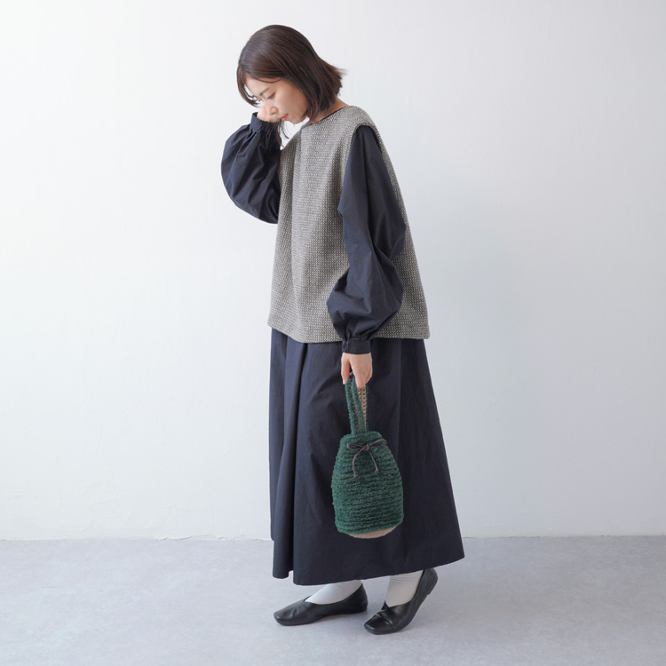 毛糸(ダークグリーン):アクリロL(50g玉巻き)/モカ(3)…2玉(86g)、ファブファー(40g玉巻き)/ダークグリーン(6)…2玉(47g)