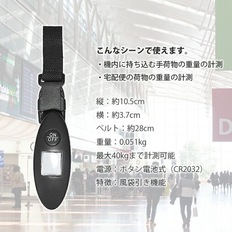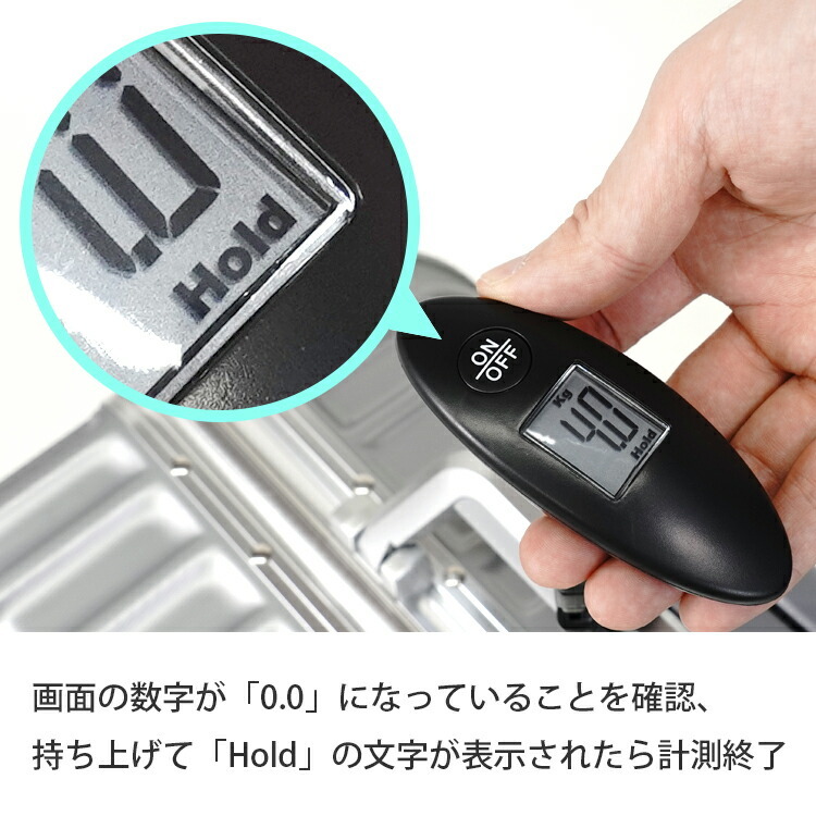 | 特徴 | 風袋引き機能 ※「Hold」状態で、そのまま床に付けず電源ボタンを押す。 「Tare」と表示されるので、そのまま荷物を乗せて計測すると「Hold」と表示され計測完了です。 |