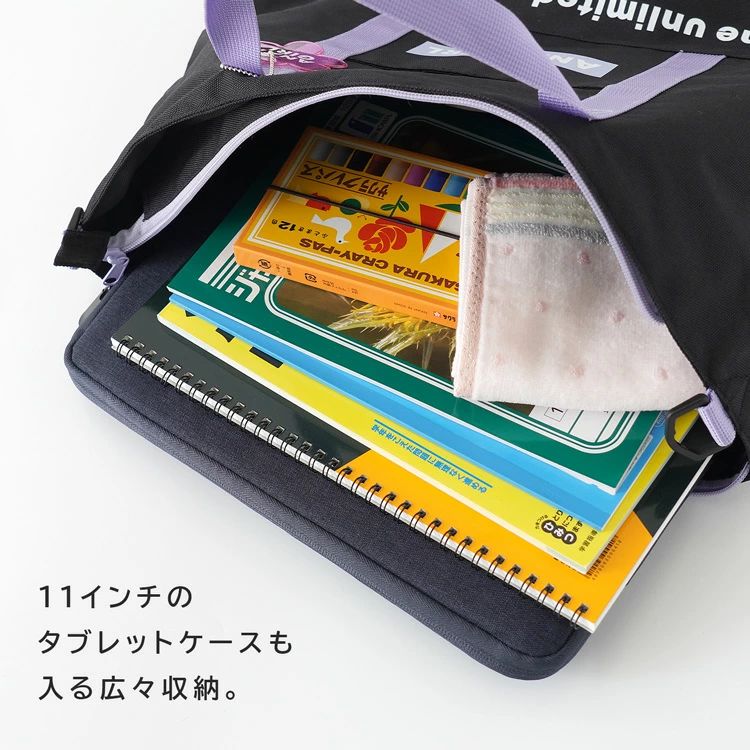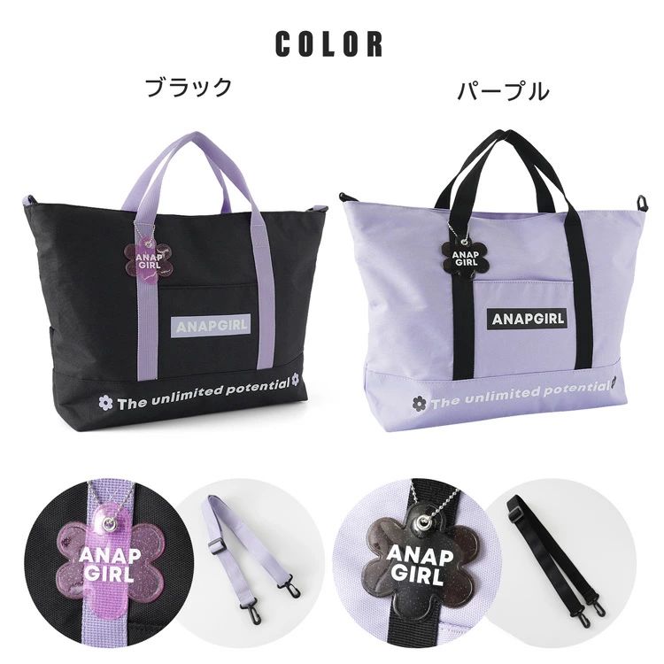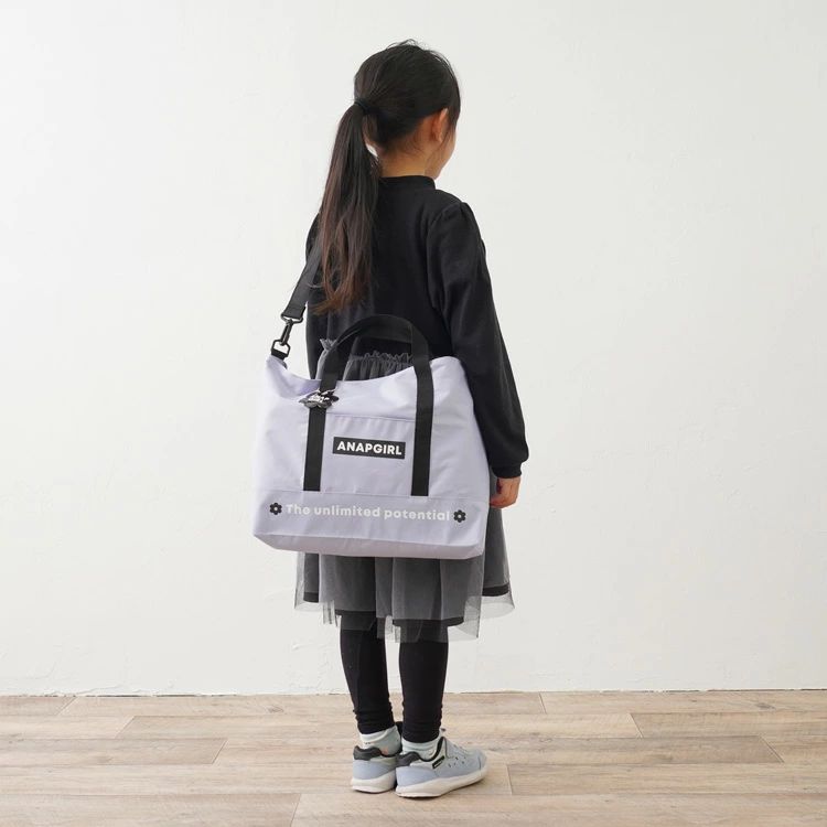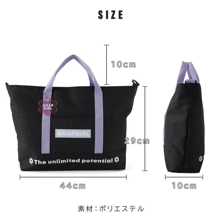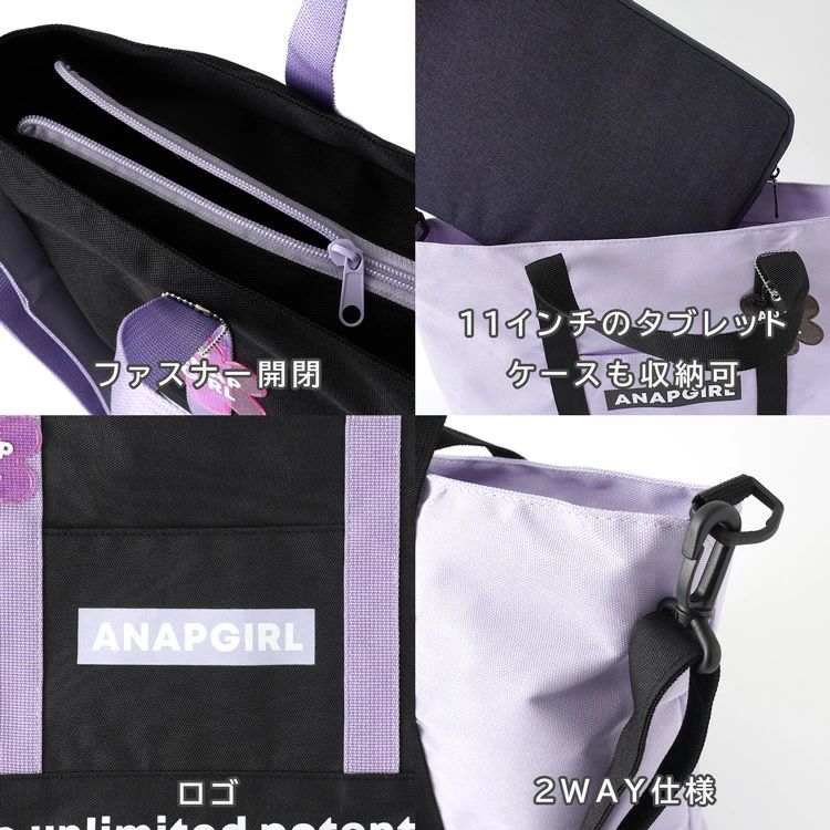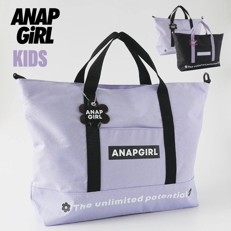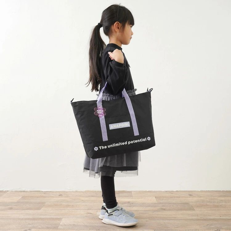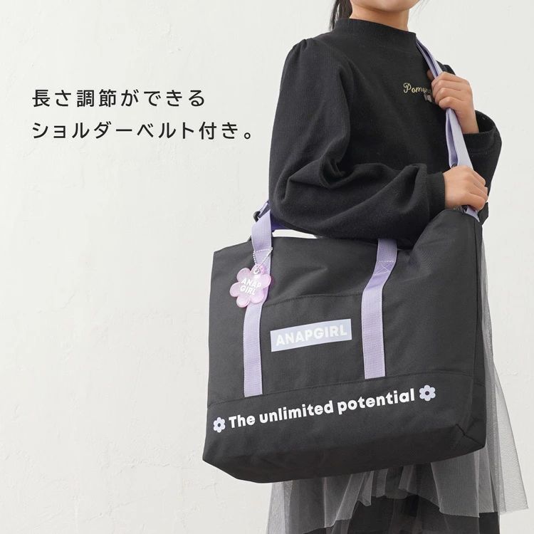 「ANAPGIRL」の2WAYトートバッグ。付け外しできるショルダーベルト付きでシーンに合わせた使い分けができます。広々マチでたくさん収納できるのも嬉しいポイント。参考画像の様に11インチのタブレットケースも楽々収納。ポリエステル素材で汚れなどもさっと拭けておすすめ。塾バッグ、お稽古、習い事などでお使いいただけます。かわいい花形のバッグチャーム付き。